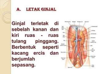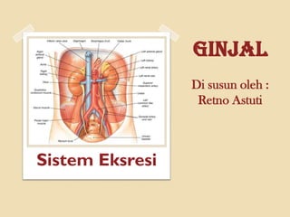 Ginjal berfungsi mengatur keseimbangan air dan elektrolit tubuh, mengatur konsentrasi osmolaritas dan asam basa, serta mengekskresikan limbah metabolisme. Ginjal terdiri atas kulit ginjal yang berisi banyak nefron dan sumsum ginjal yang berisi piramid untuk mengumpulkan hasil ekskresi sebelum dikeluarkan lewat ureter ke kantung kemih. Proses pembentukan urine meliputi filtrasai di glomerulus, reabsorpsi zat