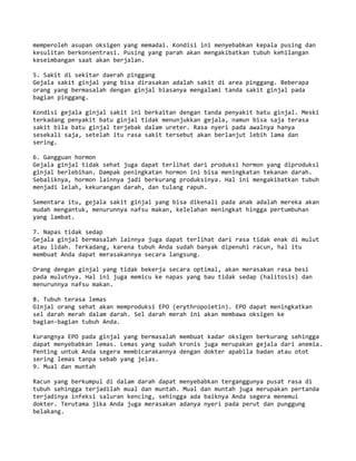 Ginjal adalah organ vital dengan fungsi utama menyaring darah, membuang limbah, dan menjaga keseimbangan cairan tubuh. Gejala sakit ginjal dapat mencakup gatal, sesak napas, dan perubahan pada urine, yang menandakan penurunan fungsi ginjal. Untuk menjaga kesehatan ginjal, penting untuk mencukupi kebutuhan air, mempertahankan berat badan ideal, dan mengonsumsi makanan bergizi.