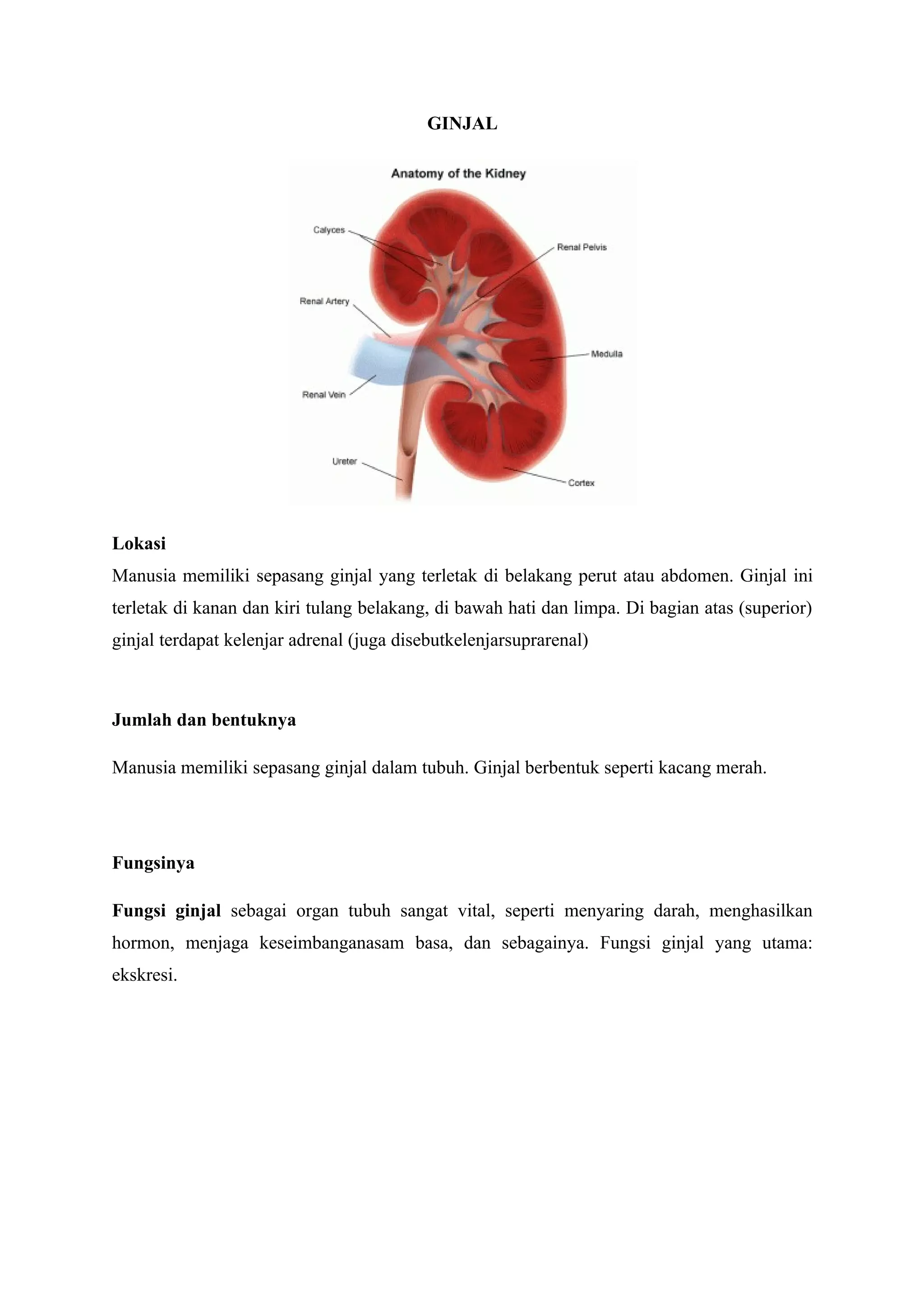 Ginjal manusia terletak di belakang abdomen dan berfungsi vital seperti menyaring darah dan menghasilkan urin. Proses pembentukan urin meliputi filtrasi, reabsorpsi, dan augmentasi yang terjadi di ginjal, dengan komposisi urin yang dihasilkan berbeda antara urin primer dan sekunder. Penyakit ginjal dapat disebabkan oleh faktor keturunan, bawaan, atau lainnya, dengan gejala yang sering muncul terlambat, dan diagnosis dilakukan melalui pemeriksaan medis.