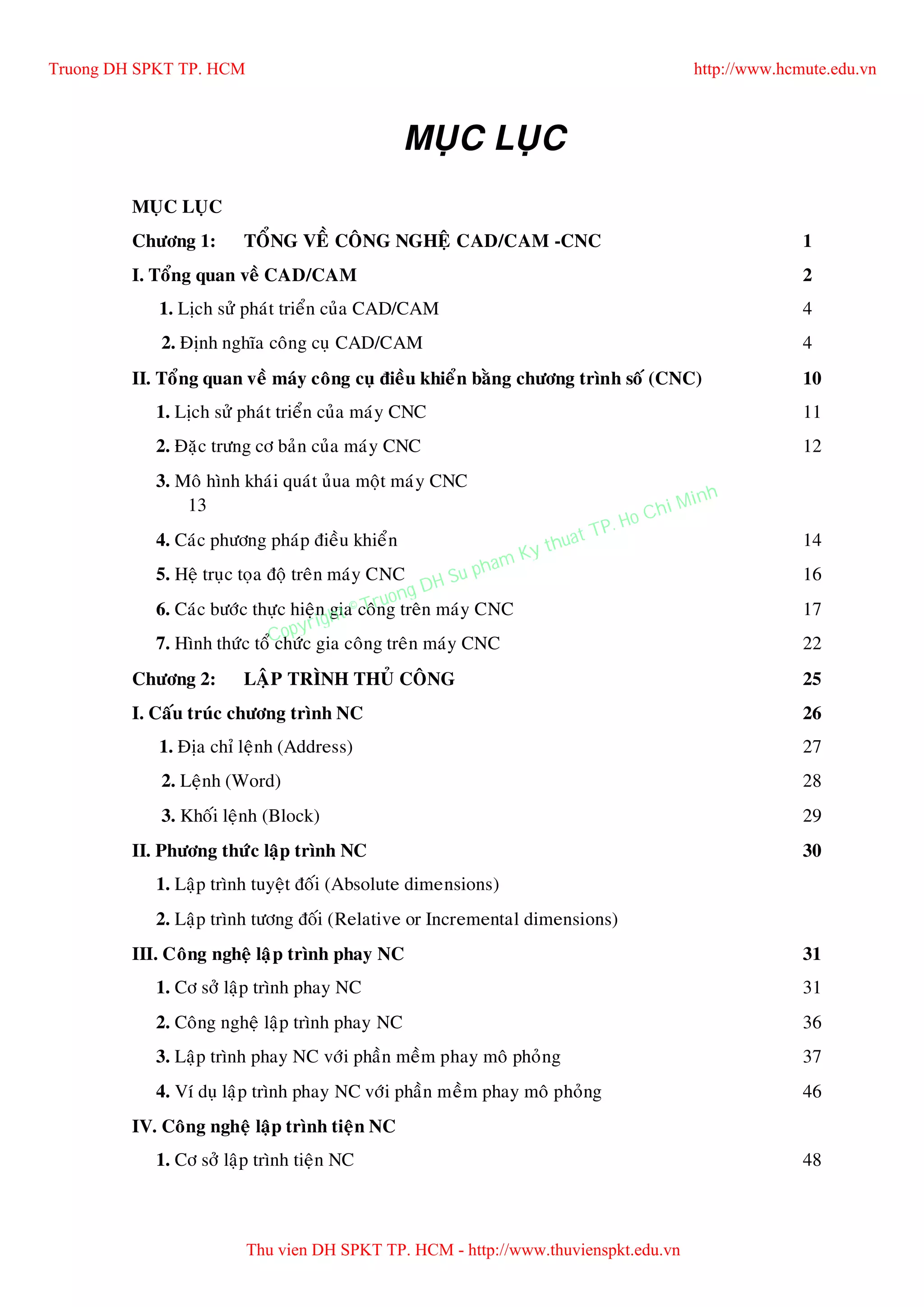 Giáo trình CAD/CAM CNC trình bày tổng quan về công nghệ CAD/CAM và máy công cụ điều khiển bằng chương trình số CNC. Tài liệu bao gồm lịch sử phát triển, khái niệm, cấu trúc chương trình NC, phương pháp lập trình và vận hành máy CNC. Nội dung cung cấp kiến thức thiết yếu cho việc thiết kế, chế tạo và tự động hóa quy trình sản xuất.