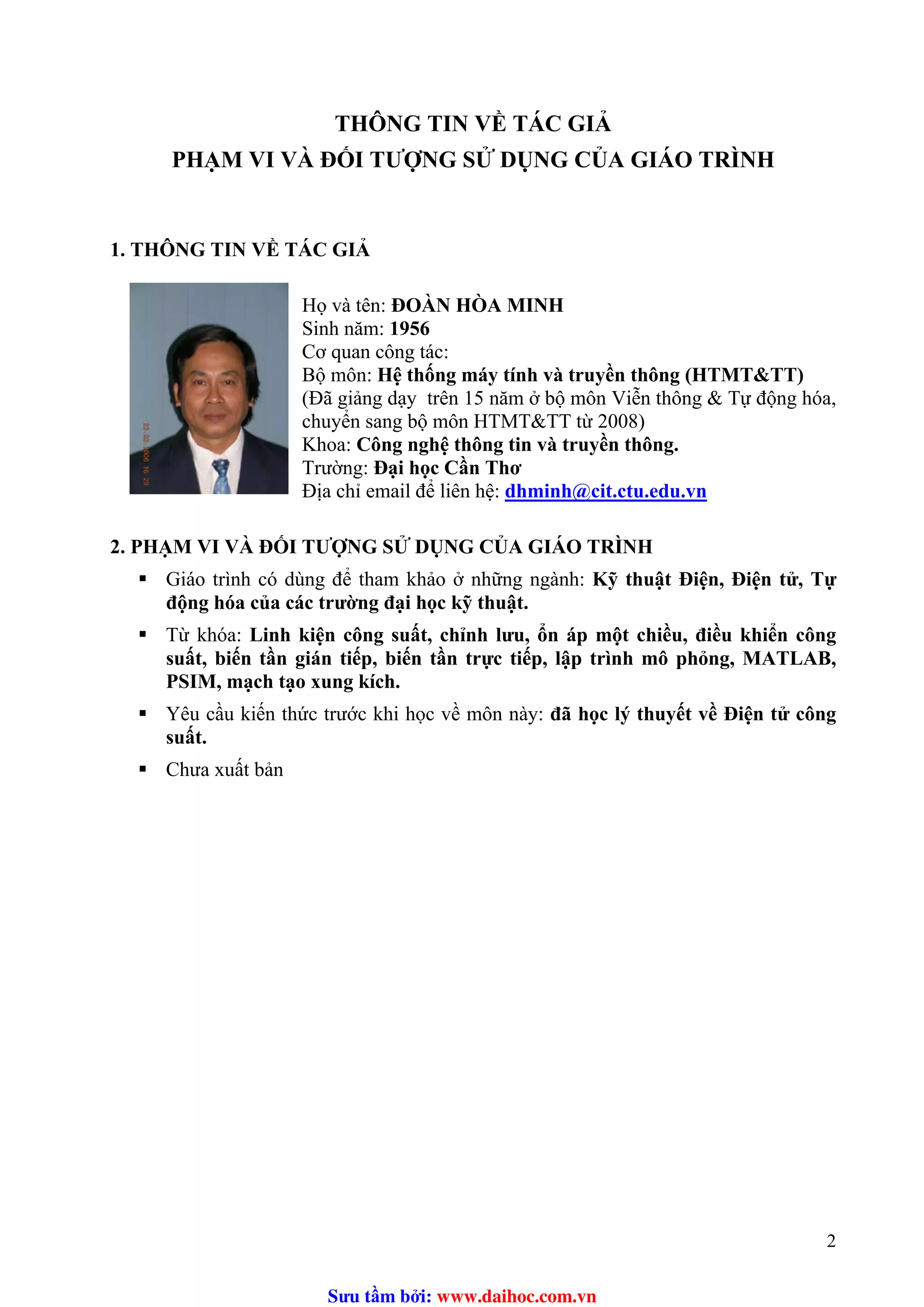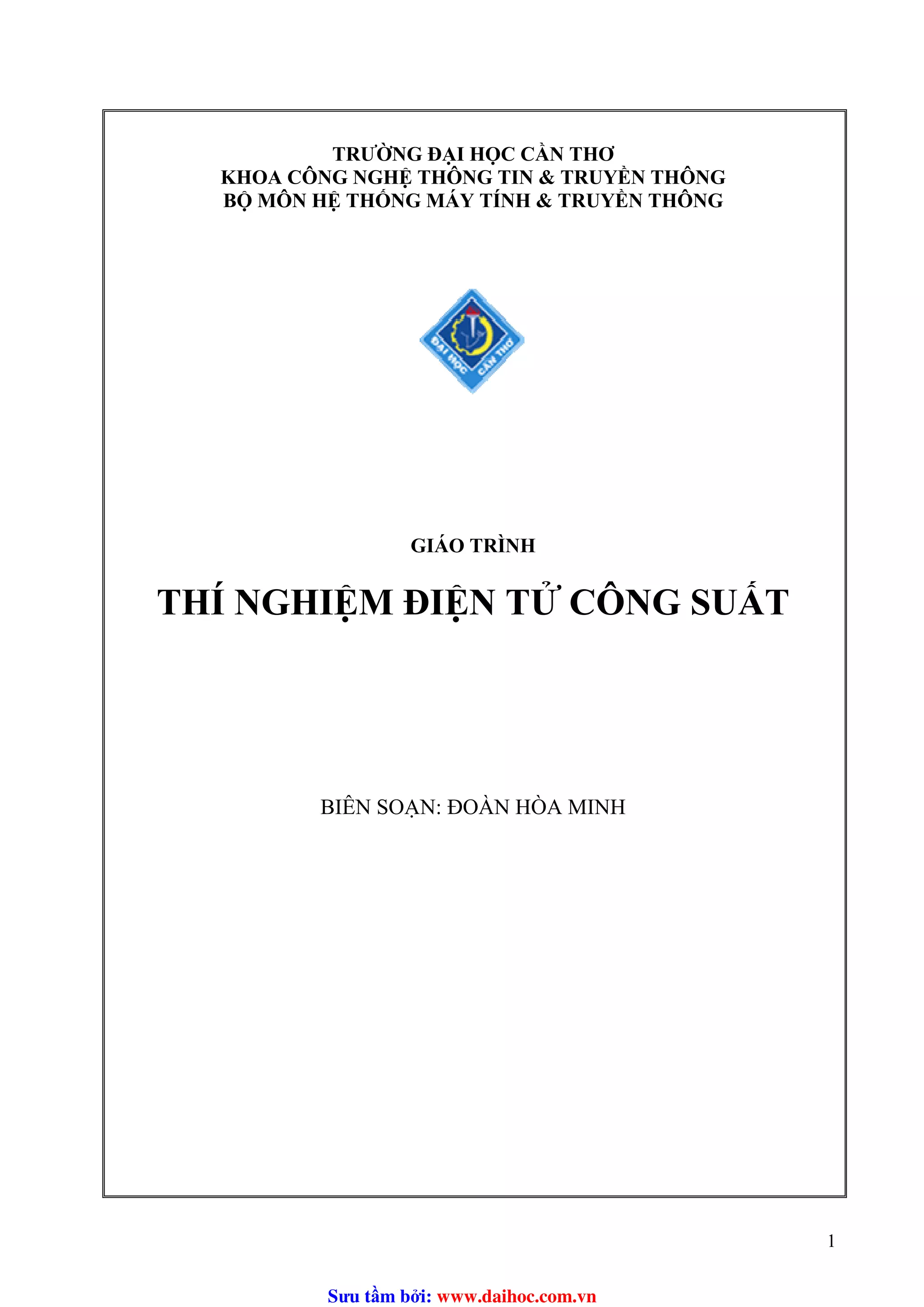 Giáo trình thí nghiệm điện tử công suất của Đoàn Hòa Minh cung cấp kiến thức nền liên quan đến linh kiện công suất như BJT, MOSFET, SCR và TRIAC, cùng với các bài thực hành thiết kế cho sinh viên ngành kỹ thuật điện, điện tử và tự động hóa. Tài liệu nhấn mạnh các quy định an toàn điện khi thực hành, nhằm bảo đảm an toàn cho sinh viên trong quá trình thực tập với điện năng cao. Giáo trình cũng bao gồm 9 bài thực hành kéo dài 60 tiết, cung cấp kiến thức thực tiễn cho sinh viên.