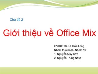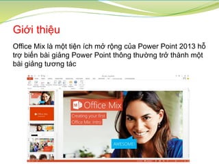 Office Mix là một tiện ích mở rộng miễn phí của PowerPoint 2013, giúp tạo bài giảng tương tác thông qua các tính năng như ghi âm, thêm nội dung tương tác và xuất ra video hoặc gói SCORM. Nó chỉ hỗ trợ trên PowerPoint 2013 và phiên bản cao hơn, và cho phép người dùng theo dõi thời gian xem bài giảng. Office Mix được xếp hạng 51 trong số 100 công cụ học tập hàng đầu năm 2015.