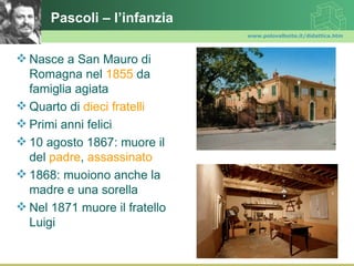 Giovanni Pascoli, nato nel 1855, affrontò una serie di traumi familiari che influenzarono profondamente la sua opera poetica, incentrata su temi come la morte e l'infanzia perduta. La sua formazione classica e umanistica, unita a un forte impegno politico, lo portarono a diventare una figura centrale della poesia decadente italiana, capace di rinnovare il linguaggio poetico e di avvicinarlo alle esperienze quotidiane. Pascoli morì nel 1912, lasciando un'eredità di poesia che ha influenzato profondamente il panorama letterario europeo.
