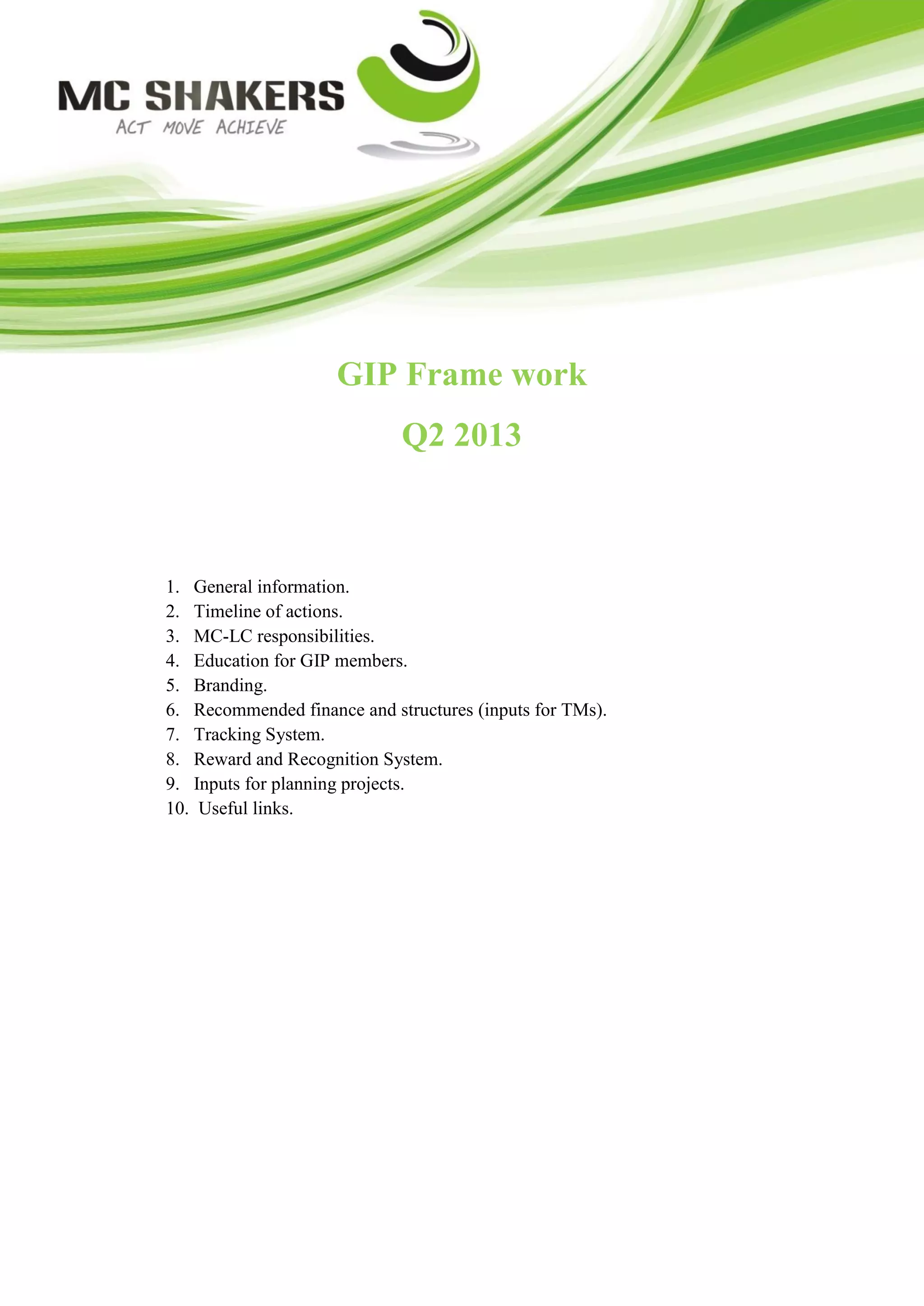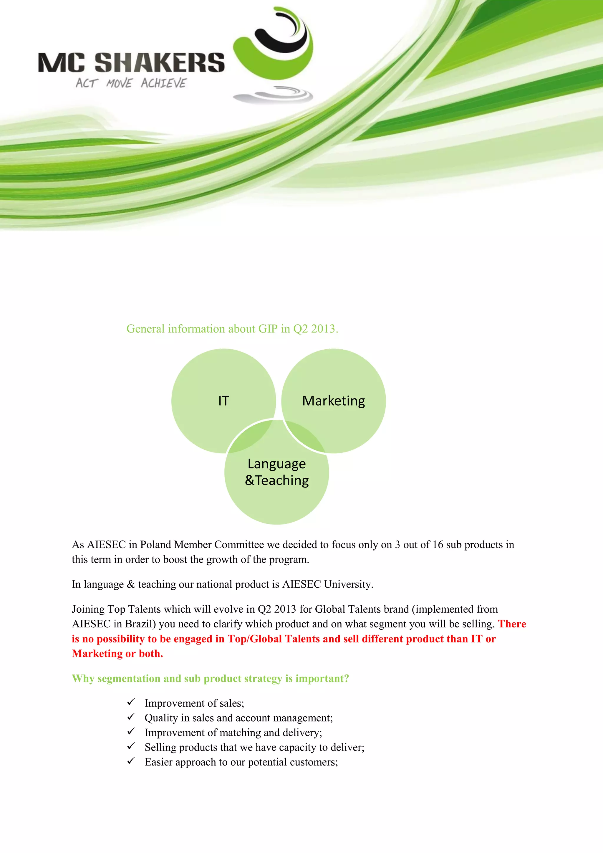 This document provides an overview of AIESEC Poland's Global Internship Program (GIP) framework for Q2 2013. It outlines the responsibilities of the Member Committee and Local Committees, including a timeline of key actions and events. It also discusses segmentation of subproducts, education of GIP members, branding, finance structures, a tracking system, rewards, planning inputs, and useful wiki links. The focus is on boosting growth in IT, Marketing, and Language & Teaching internships through focused efforts in sales, delivery, and program management.