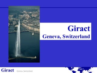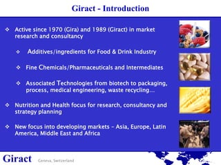 Giract is a market research and consulting firm based in Geneva, Switzerland that has been operating since 1970. It focuses on additives and ingredients for the food and drink industry, fine chemicals and pharmaceuticals, and associated technologies. Giract conducts research, consultancy, and strategic planning with a focus on nutrition and health. It offers multi-client studies, confidential customized studies, conferences, publications, and scenario planning to clients in industries such as food and agriculture. Giract works with global clients and aims to expand into developing markets in Asia, Europe, Latin America, the Middle East, and Africa.