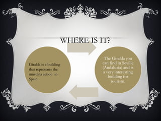 Giralda is the bell tower of the Cathedral of Santa Maria in Seville, Spain. It was originally built during the Muslim rule in Spain between the 12th-14th centuries as the minaret of the main mosque. The tower has since been incorporated into the cathedral and represents the Muslim influence on architecture in medieval Spain.