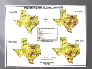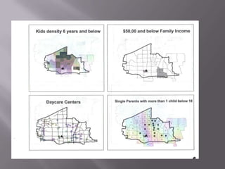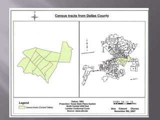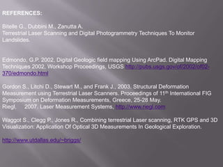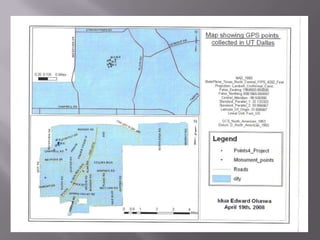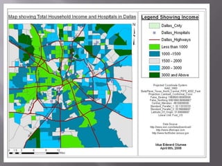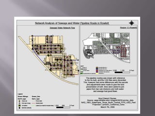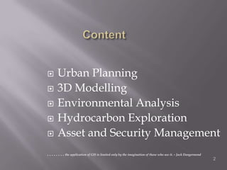 This document discusses applications of geographic information systems (GIS) including urban planning, 3D modeling, environmental analysis, and hydrocarbon exploration. It provides examples of how GIS has been used for urban planning tasks like siting a daycare, modeling population change, and analyzing transportation networks. 3D modeling applications include generating high-resolution digital models from laser scanning data for uses like mapping, education, and engineering. Environmental analysis examples include examining the relationship between toxic sites and disadvantaged communities. The document also discusses GIS applications in hydrocarbon exploration like mapping fields and reservoirs, seismic interpretation, and production analysis to optimize resource development.