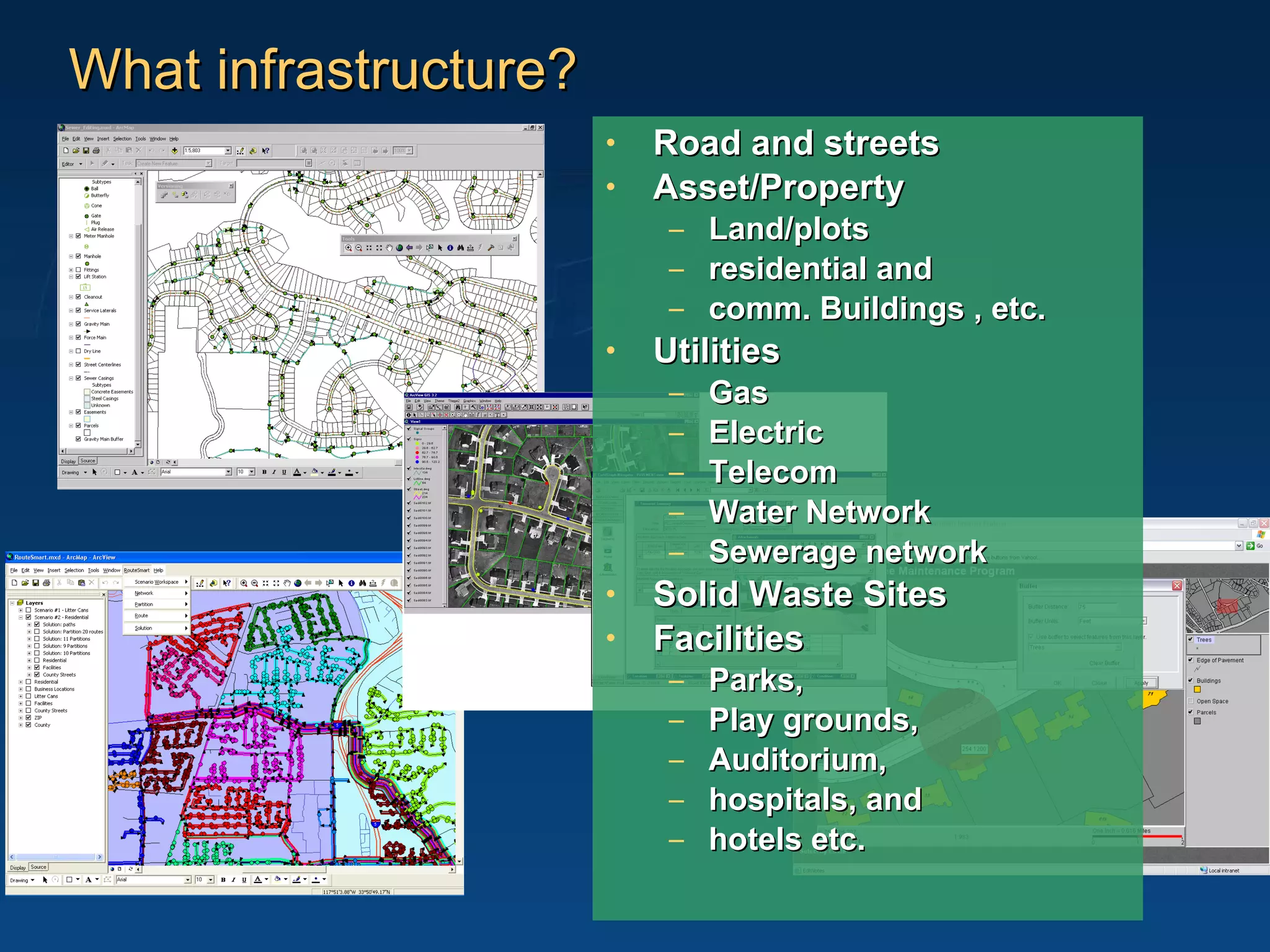 The document discusses how geographic information systems (GIS) can play a key role in infrastructure planning and management. GIS can help integrate data from different systems and stakeholders, consolidate infrastructure records in a centralized database, and provide insights to support various functions like construction, maintenance, operations, customer service, and decision making. Implementing an enterprise GIS solution allows an organization to overcome information silos, improve collaboration, deliver cost savings and productivity gains, and maximize return on investment over the entire life cycle of infrastructure projects and assets.