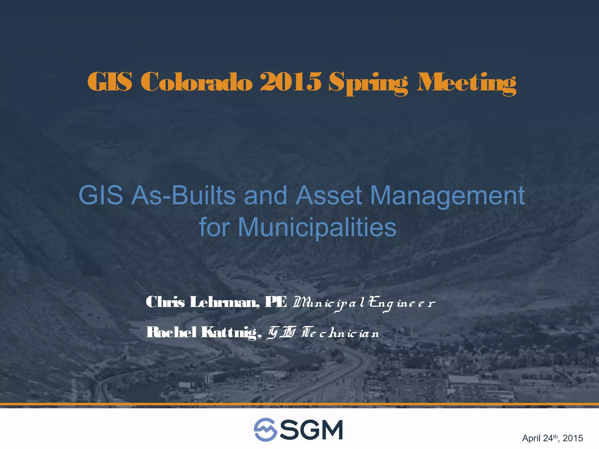 The document discusses GIS as-builts and asset management for municipalities. It describes how GIS technicians can collect location and asset data in the field using GPS during construction projects to pre-populate GIS maps. This avoids digitizing later and allows clients to track project progress. Benefits include accurate feature location, easy data sharing and retrieval, and a foundation for asset management. Interactive maps using GIS as-built data, ArcGIS Online and apps can then help track infrastructure and plan maintenance.