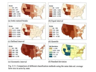 This document discusses the preparation and presentation of geospatial data in maps. It defines spatial data as data that identifies geographic locations on Earth, such as natural or constructed features. It describes the main types of spatial data as raster, vector, and real world data. Raster data represents features as a grid of cells, while vector data represents features as points, lines, and polygons. The document discusses techniques for collecting, classifying, and mapping different types of spatial data, including raster, vector, nominal, categorical, ordinal, and numerical data. It also covers topics like thematic mapping, data normalization, and chart maps.