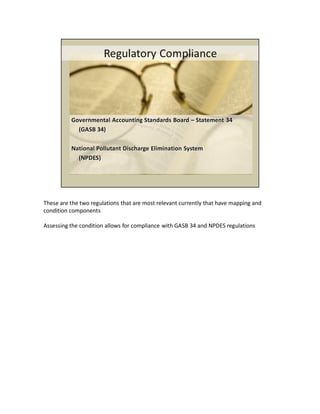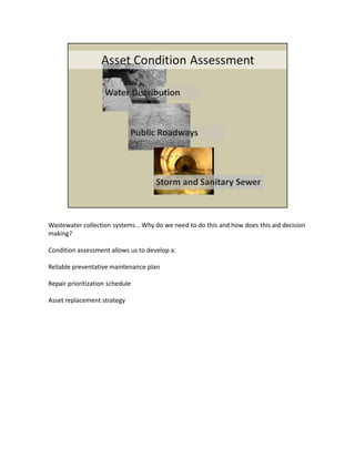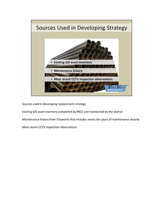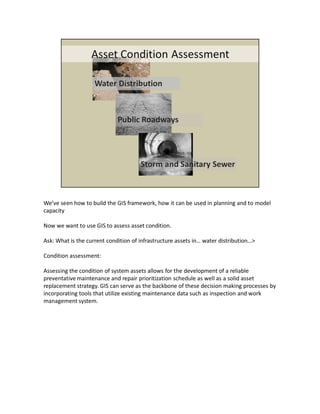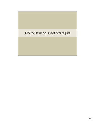 The document discusses how GIS can be used as an information backbone to support effective decision making. It provides examples of how GIS has been used for capacity analysis, capital improvements planning, and developing asset management strategies. Specifically, it describes how GIS data, modeling, and analytics can help infrastructure managers make informed decisions, minimize risks, and save time and expenses when planning maintenance and capital projects.