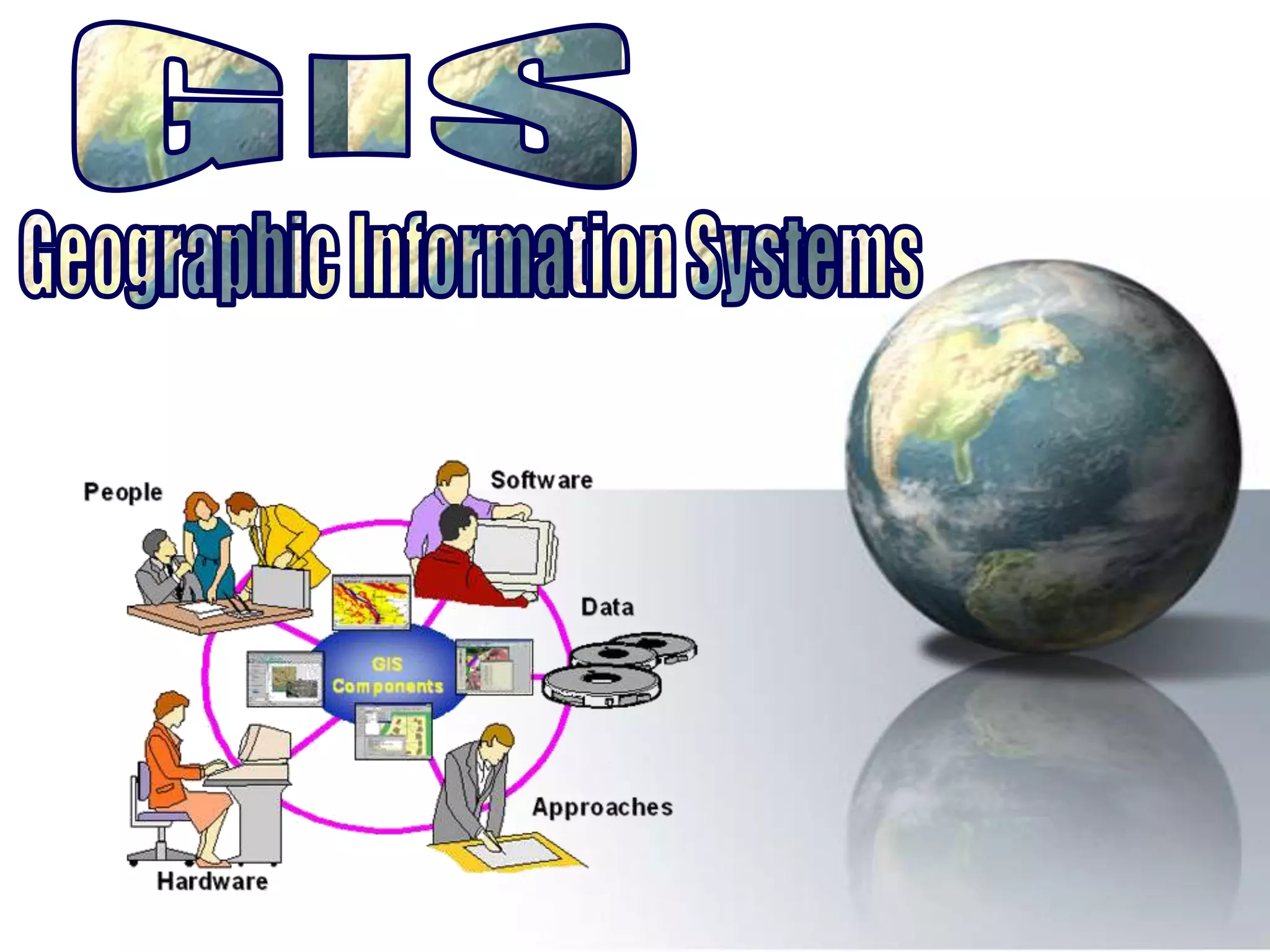 نظم المعلومات الجغرافية (GIS) هي أنظمة حاسوبية لجمع وتخزين وتحليل وعرض البيانات الجغرافية في طبقات متعددة. تشمل المكونات الرئيسية لهذه الأنظمة البرمجيات والأجهزة وبيانات إدارة نظم المعلومات، حيث تعتبر البيانات عنصرًا أساسيًا. نجاح نظام المعلومات الجغرافية يعتمد على الكفاءة التقنية والبرمجيات المناسبة ومدى تدريب الأفراد القادرين على إدارة وتحليل البيانات.