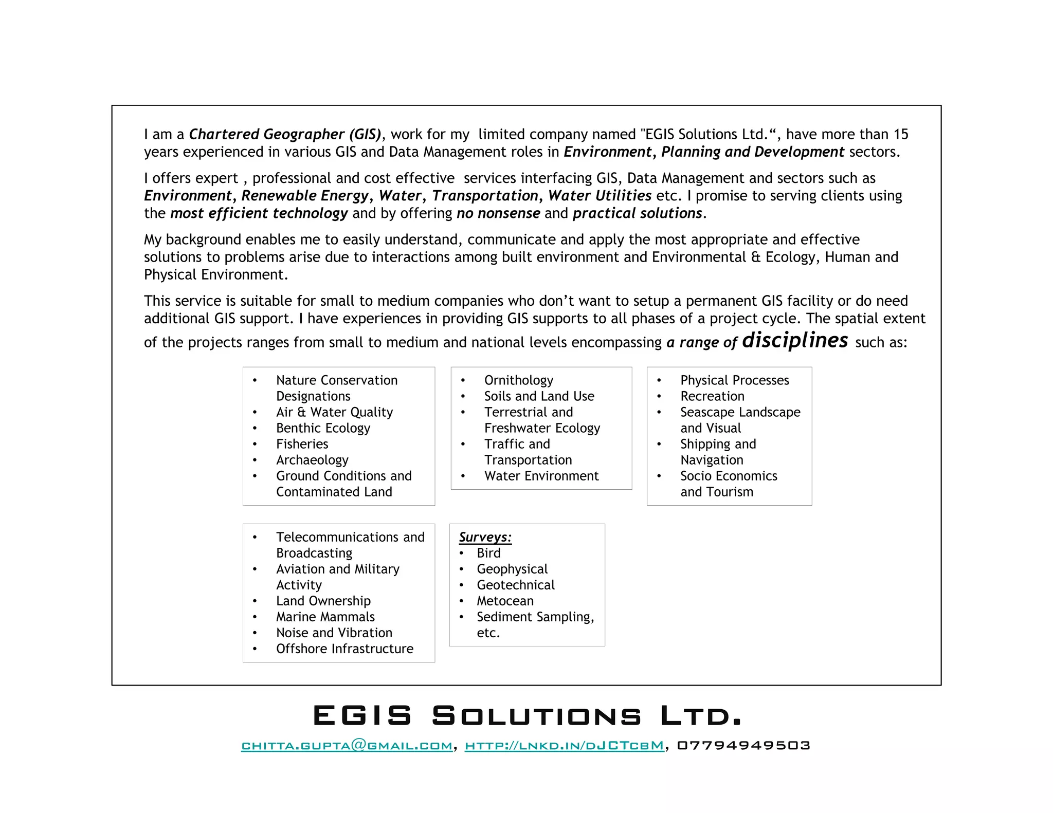 Egis Solutions Ltd. is a GIS and data management company with over 15 years of experience, offering cost-effective services across various sectors including environment, renewable energy, and transportation. The company supports small to medium enterprises by providing expert GIS assistance throughout all project phases, utilizing advanced technologies and methodologies. Notable projects include GIS support for offshore wind projects, EIA for road improvement, and renewable energy assessments, showcasing a comprehensive range of GIS applications and data management solutions.