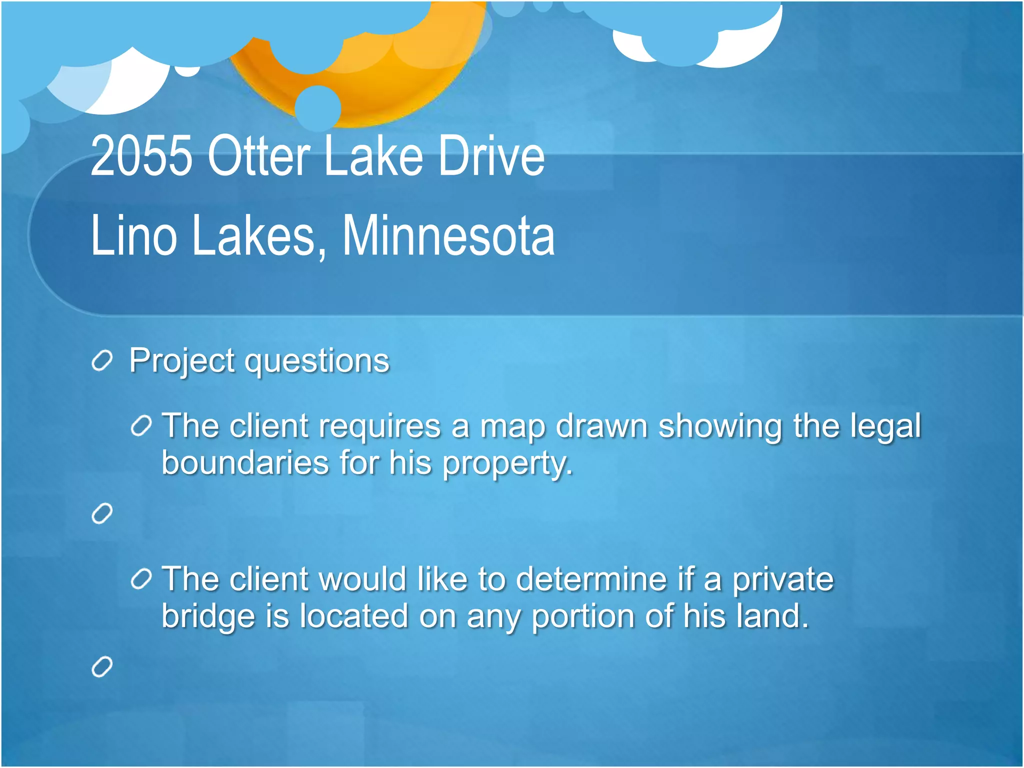 The client has requested a map showing the legal boundaries of their property in Lino Lakes, Minnesota. This will involve snapping together existing plat maps, interpreting the legal description, and conducting field work to GPS coordinate the property lines and attributes. Additional data layers will need to be incorporated to determine if any portions of the land contain a private bridge, wetlands, or a water channel. The final map is intended solely for the client's personal use.
