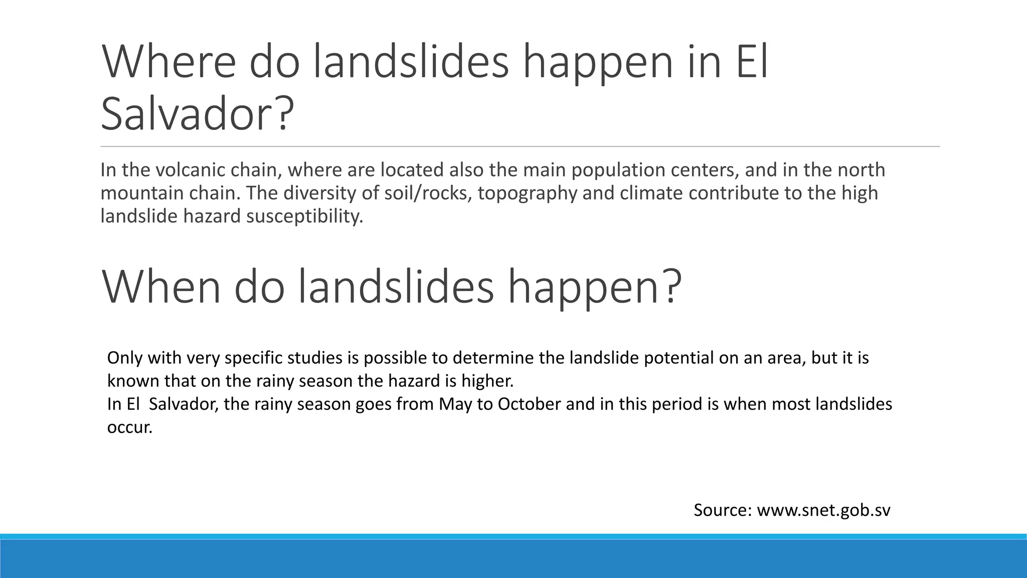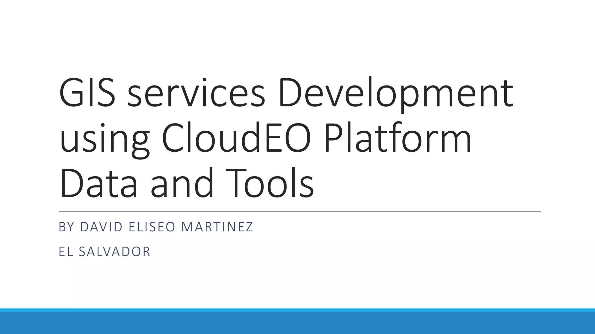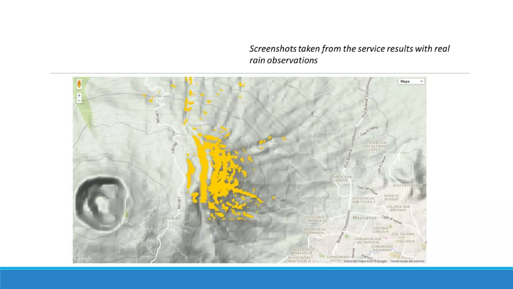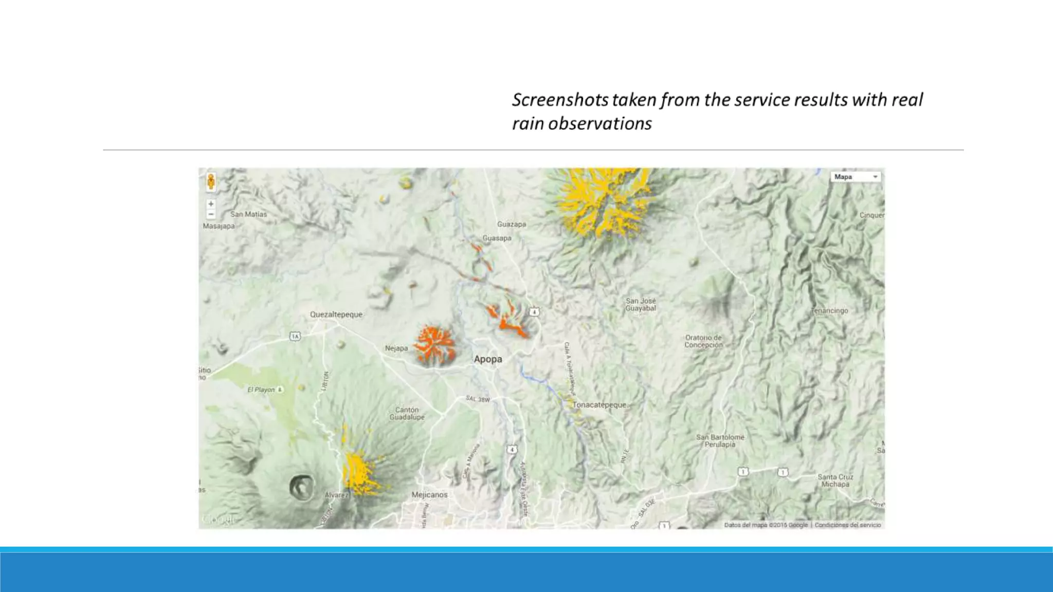 This document describes the development of a GIS service using CloudEO Platform data and tools to visualize areas in El Salvador that have a higher susceptibility to landslides based on slope, rainfall data, and historical landslide events, with the goal of providing early warning systems that are accessible via mobile, desktop, and web applications. The process involves collecting and interpolating rainfall observations, reclassifying the data according to warning levels, and intersecting it with pre-generated slope data to identify at-risk areas. Screenshots from the service show maps highlighting susceptible regions based on real-time rainfall observations.