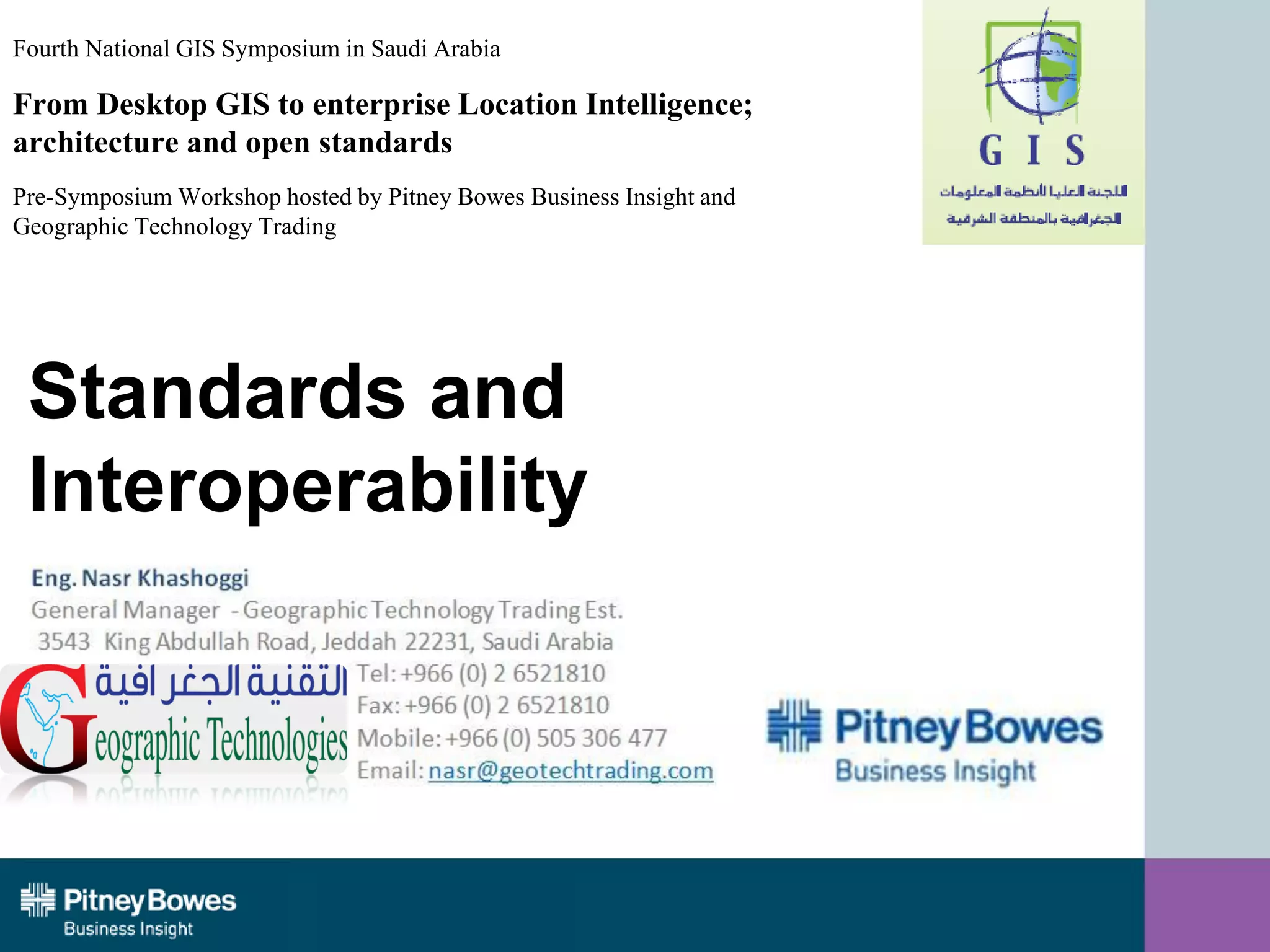 This document discusses standards and interoperability in geographic information systems (GIS). It emphasizes that standards are important for sharing data between government departments and making location-based data accessible to citizens. It outlines some relevant technical standards like OGC, ISO, and OpenLS. The document also discusses challenges around reading, displaying, and editing spatial data from different sources and solutions like spatial databases and web services. Finally, it provides details on how standards will be implemented for a GIS project in Madinah, Saudi Arabia, including the use of Oracle, Envinsa, web services, and OGC standards.
