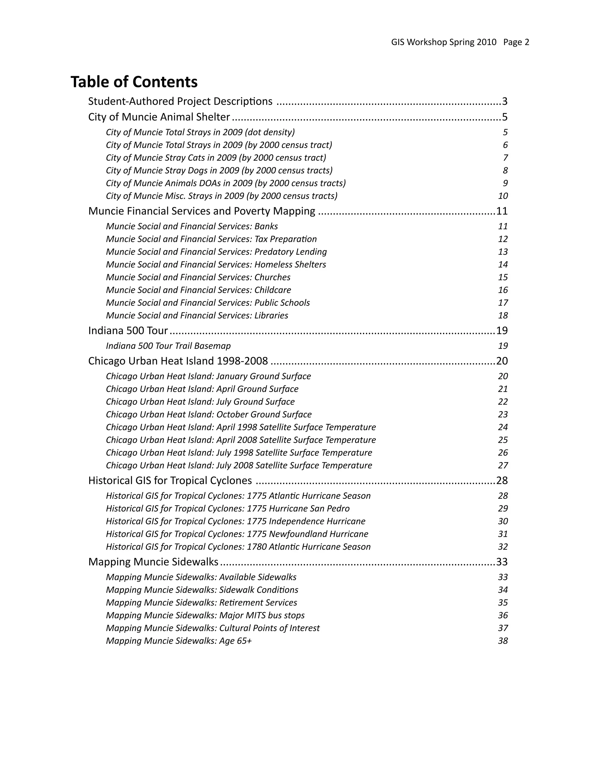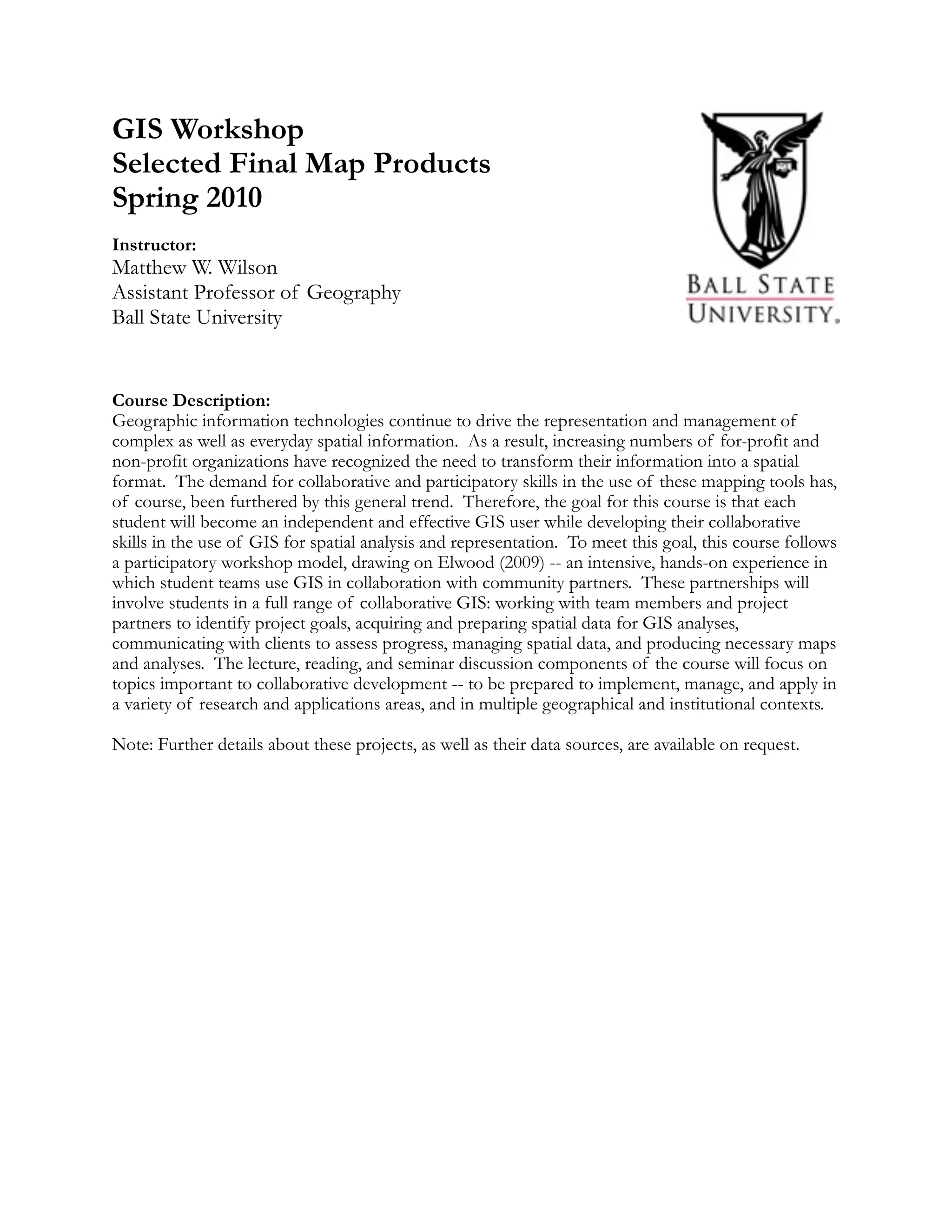 The document outlines a GIS workshop course led by Matthew W. Wilson at Ball State University, focusing on geographic information technologies and their application in community collaboration. Students engage in hands-on projects to create spatial analyses and visualizations for local entities, addressing issues like stray animals, financial services, and urban heat islands. Various student projects are detailed, highlighting the role of GIS in improving community service delivery and understanding urban phenomena.