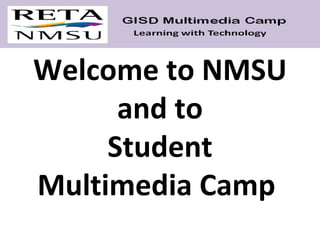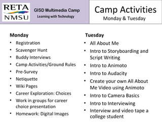 The document outlines the schedule and activities for a Student Multimedia Camp held Monday through Friday. On the first two days, students will register, do icebreakers, learn about careers and create an introductory video about themselves. The middle two days include tours of the Creative Media Institute and computer lab, learning animation and editing tools. Students will create and share digital stories. The last day is for finishing projects and sharing completed work in a theater. Rules include caring for equipment, keeping devices off, staying with groups, and being respectful of others.