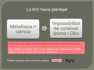 LaKrV havia plantejatKant mai no va negar la immortalitat de l’ànima o l’existència de Déu.Va establir que ànima i Déu no són objectes de coneixement científic objectiu perquè ànima i Déu no són fenòmens. KpVParlarà d’aquest tema de forma positiva