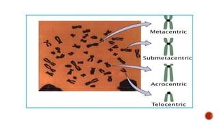 Chromosomes are rod-shaped structures found in the nucleus that carry genetic information. They become visible during cell division. In situ hybridization (ISH) allows the localization of nucleic acid sequences on chromosomes using probes. Fluorescence in situ hybridization (FISH) is a type of ISH that uses fluorescent probes to visualize specific sequences. FISH has applications in gene mapping, detecting genetic abnormalities, and identifying chromosomes.