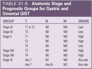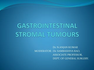 This document provides an overview of gastrointestinal stromal tumors (GISTs). It discusses the epidemiology, molecular mechanisms, clinical presentation, imaging, treatment, and outcomes of GISTs. GISTs are the most common mesenchymal tumors of the gastrointestinal tract. They originate from interstitial cells of Cajal and are characterized by gain-of-function mutations in KIT or PDGFRA genes. Treatment involves surgery when possible as well as targeted therapy with drugs like imatinib, which inhibits KIT and other oncogenic proteins. Close monitoring is important after treatment due to the risk of recurrence.