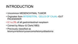 - Gastrointestinal stromal tumor (GIST) is an uncommon mesenchymal tumor that originates from interstitial cells of Cajal in the gastrointestinal tract.