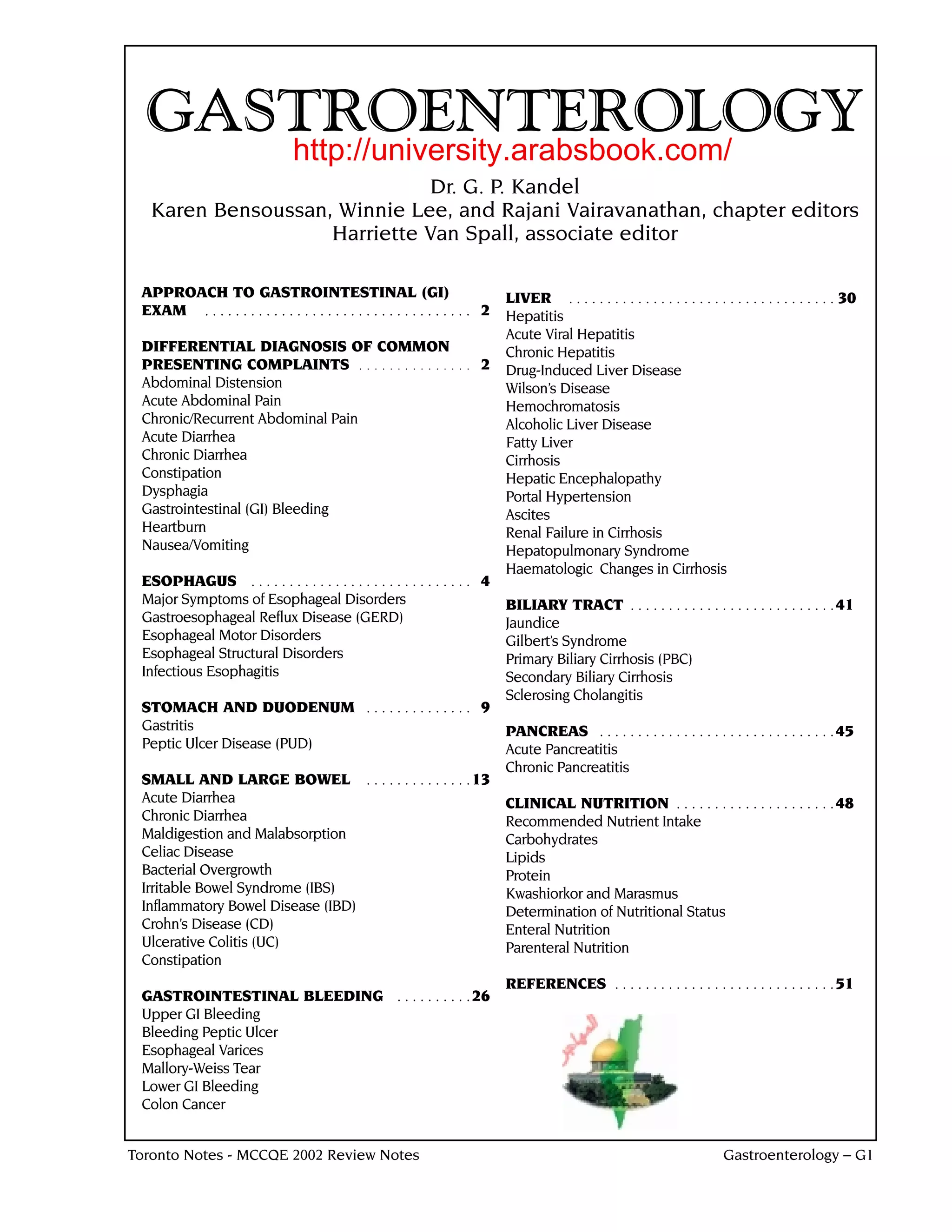 This document provides an overview of gastroenterology. It begins with an approach to the gastrointestinal exam and a differential diagnosis table of common presenting complaints involving various gastrointestinal symptoms. It then covers specific sections on the esophagus, stomach and duodenum, small and large bowel, liver, biliary tract, pancreas, gastrointestinal bleeding, and clinical nutrition. For each section, it lists and briefly describes common disorders. The esophagus section focuses on dysphagia, heartburn, and gastroesophageal reflux disease.