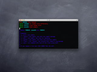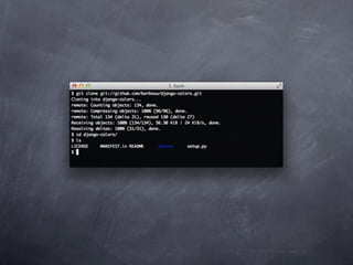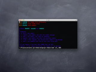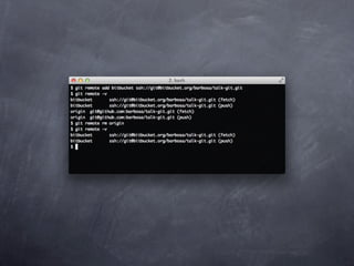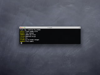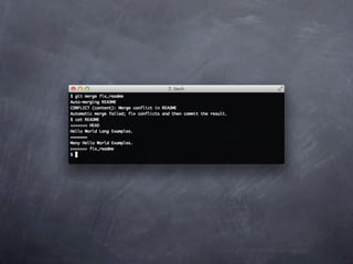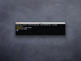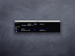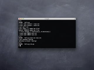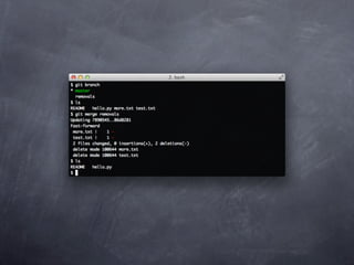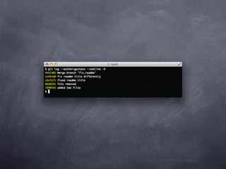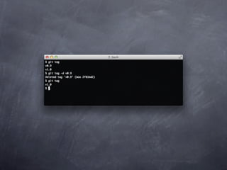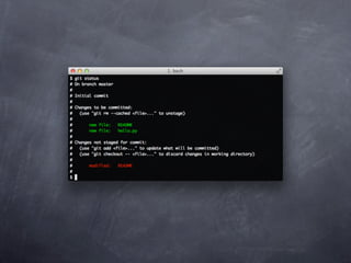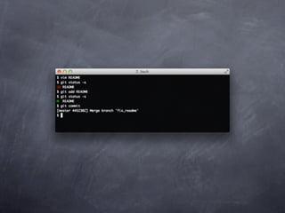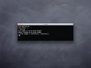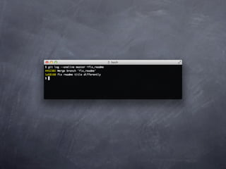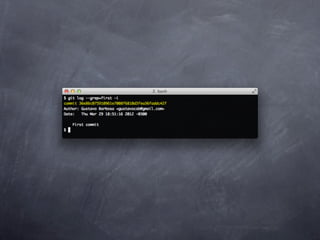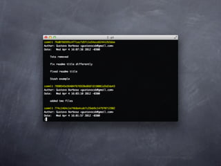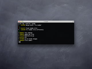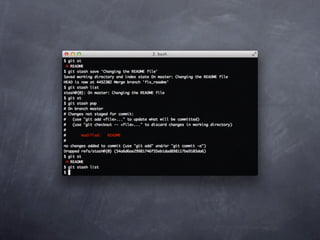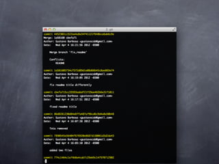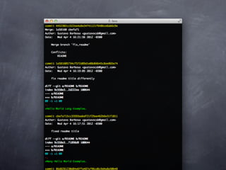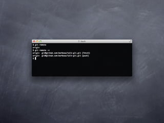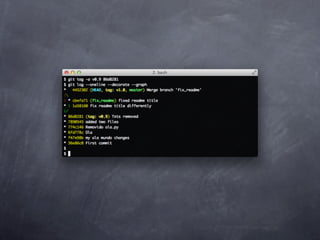 Git is a version control system that allows pulling and pushing code to/from repositories. It initializes local repositories with git init and clones remote repositories with git clone. Files can be added, committed, and pushed to save snapshots of the code. Branches allow parallel development and merging changes. Logs show commit histories and tags mark important points. Remotes connect to shared repositories to fetch, pull and push code updates.