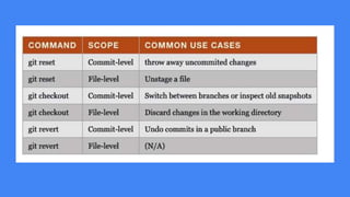 The document provides an overview of common Git commands organized into categories like init/clone, add/commit, branch, log, diff/blame, undo/revert, merge/rebase, remote operations and more. It also includes explanations of concepts like the three main areas in Git (working directory, staging area, HEAD), and tips like using fetch instead of pull and following a forking workflow. The document is intended to teach attendees the essentials of using Git through explaining commands and best practices.