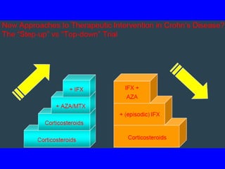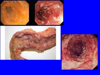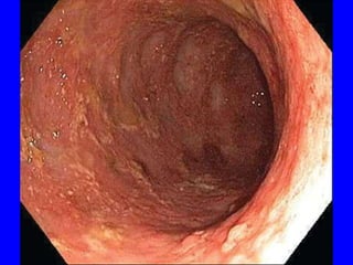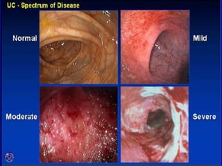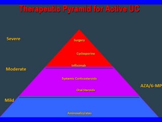 This document provides an overview of inflammatory bowel disease (IBD), including ulcerative colitis and Crohn's disease. It discusses risk factors, clinical manifestations, diagnostic testing, and treatment approaches. The main points are: