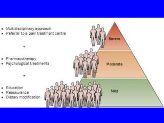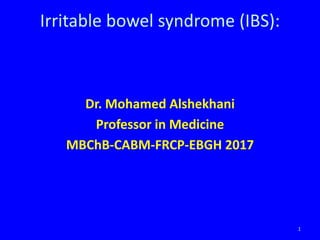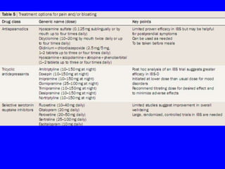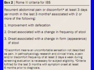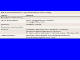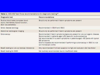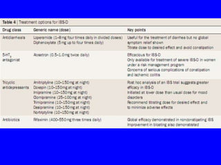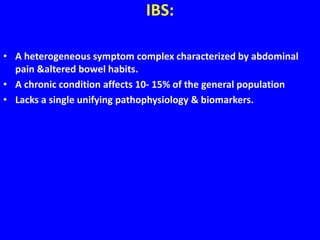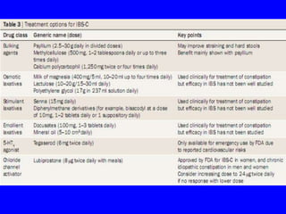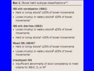 This document provides information on irritable bowel syndrome (IBS), including its definition, diagnostic criteria, subtypes, differential diagnosis, evaluation, and management approaches. Some key points: