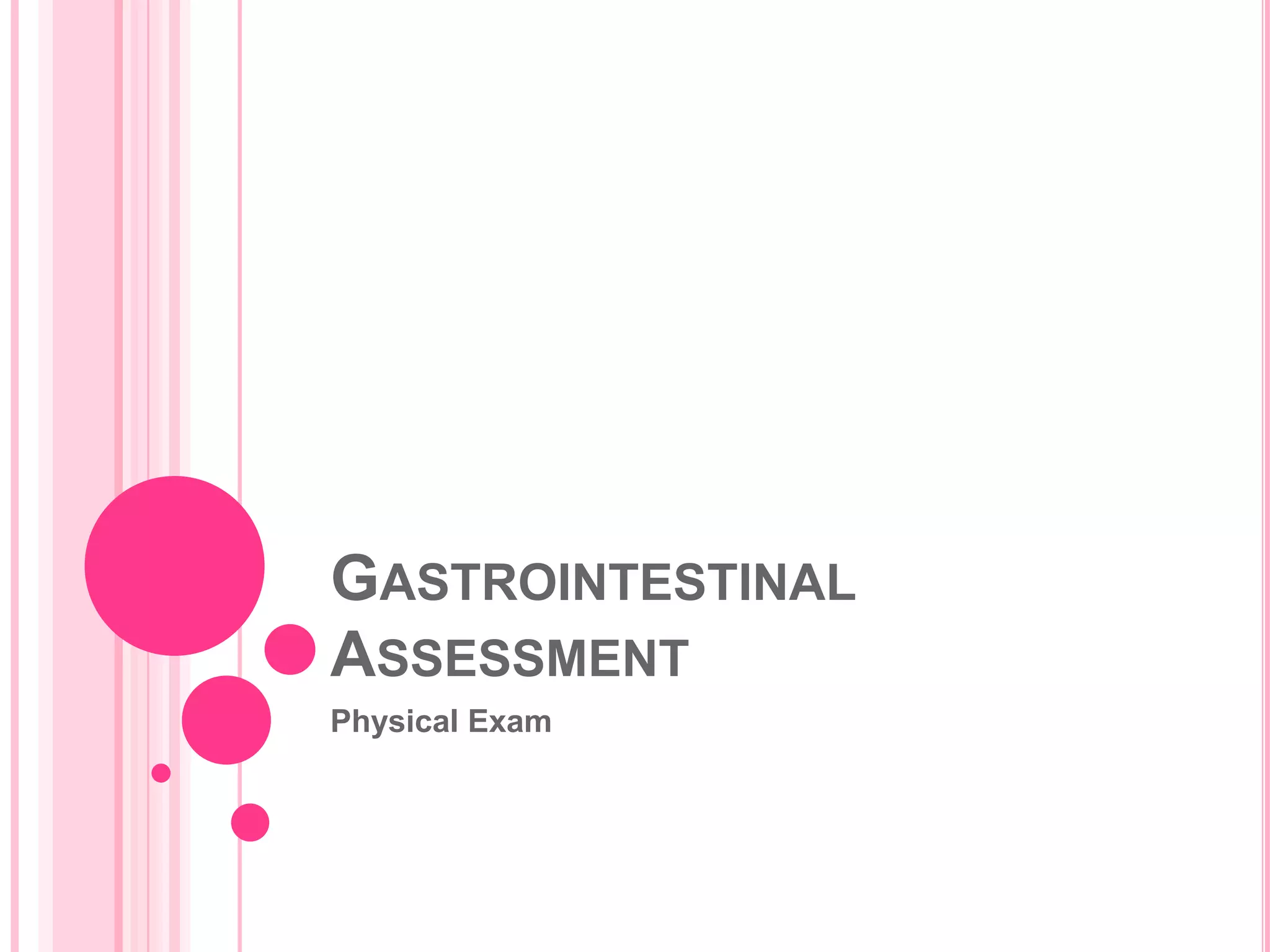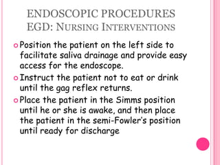 This document provides information on assessing patients for gastrointestinal issues. It outlines steps for a physical exam including inspection of the mouth and abdomen. It describes common GI symptoms like pain, indigestion, changes in bowel habits, and blood in the stool. Diagnostic tests are discussed including blood tests, stool tests, imaging studies, and endoscopy. Nursing interventions are described for preparing patients and providing care and education during diagnostic procedures.