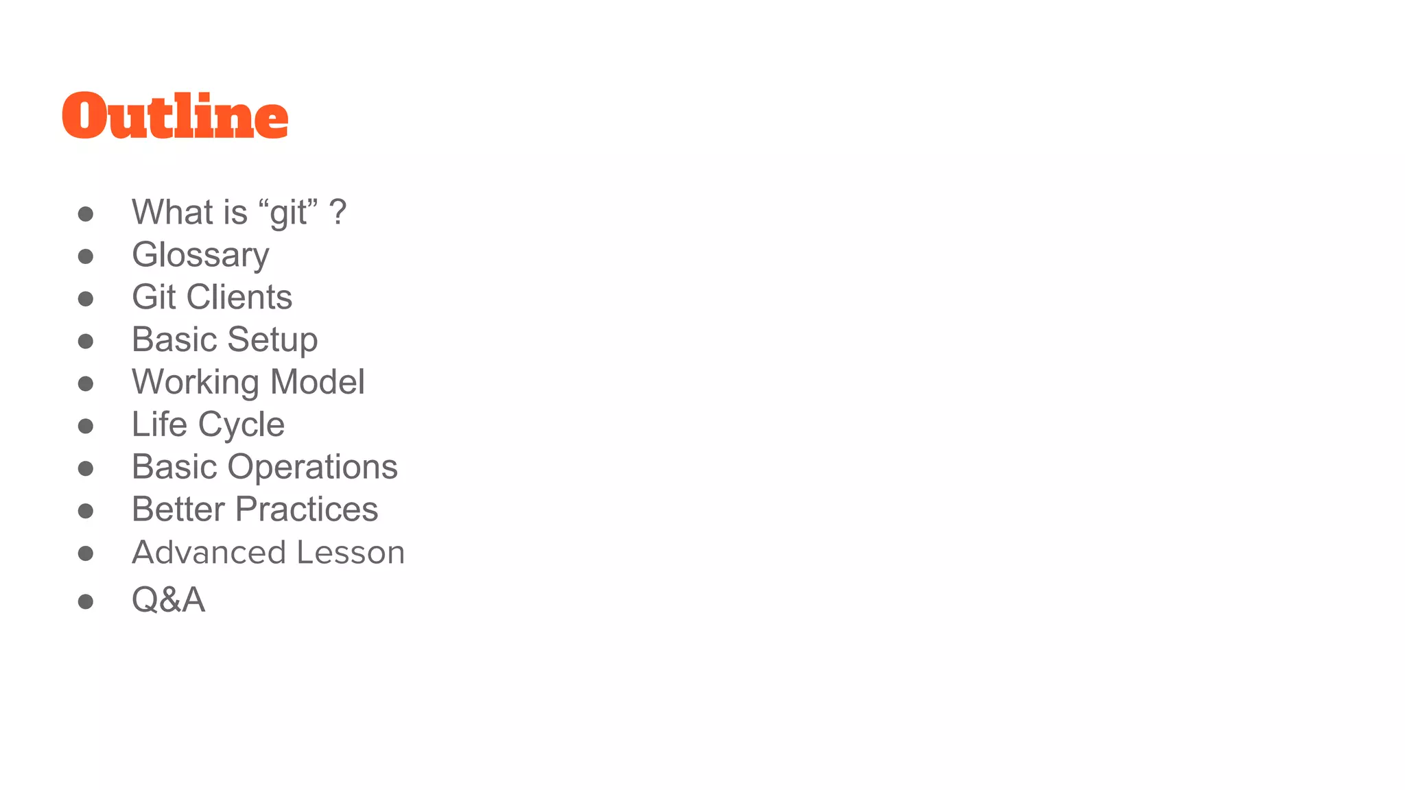 The document outlines Git, a distributed version control system, and includes its basic setup, operations, and life cycle states. It covers fundamental concepts such as commits, staging, and untracked files, along with advanced operations like merging and rebasing. Additionally, it emphasizes better practices for using Git effectively and provides useful links for further learning.