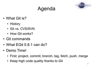 This document discusses Git and the Eclipse Git integration tool EGit. It provides an overview of Git's history and how it works, compares it to other version control systems, demonstrates common Git commands, and describes what EGit can do. The presentation then demonstrates using EGit for basic tasks like committing and branching, as well as more advanced workflows involving remote repositories and code review.
