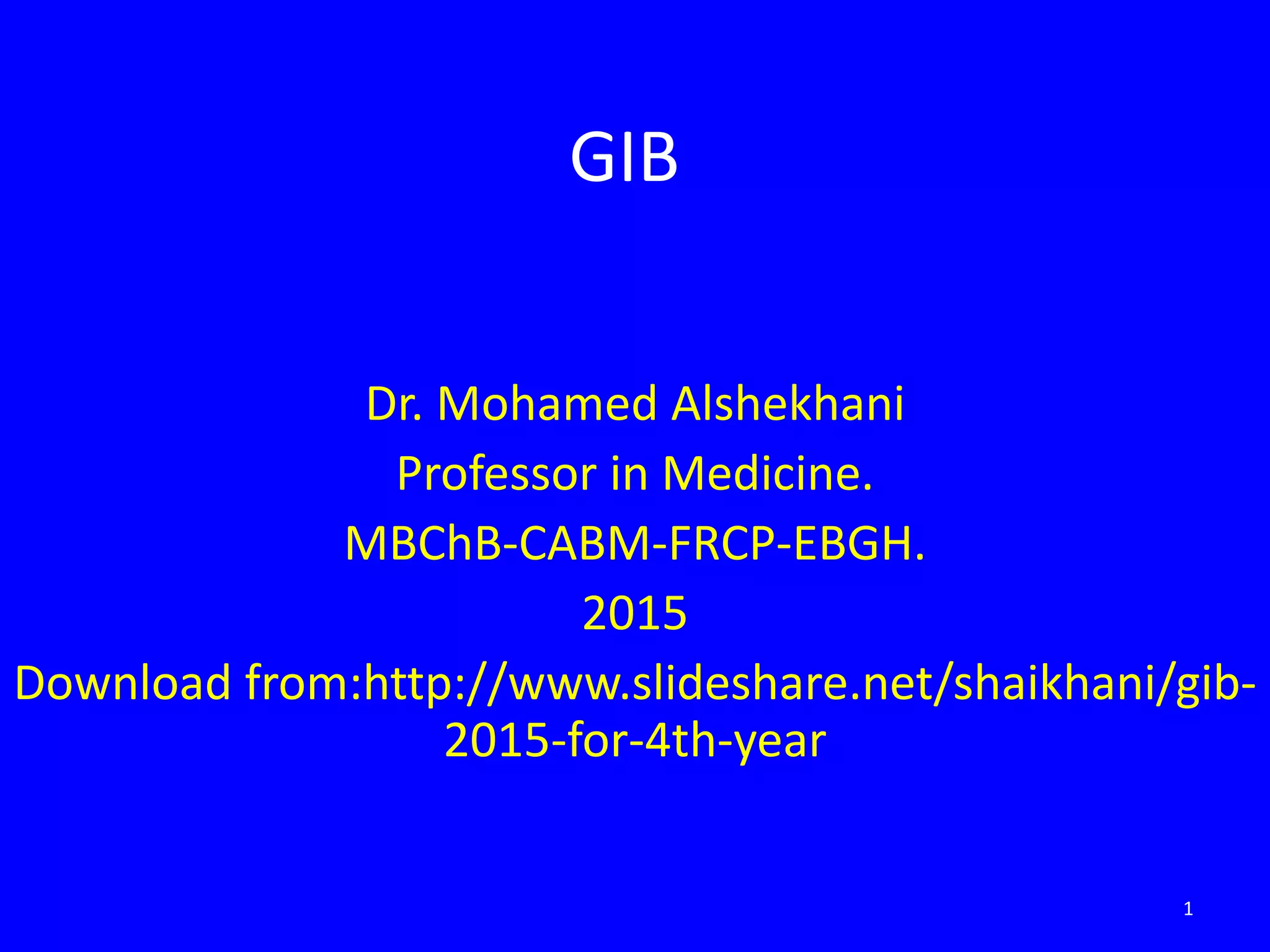- The document provides an overview of gastrointestinal bleeding (GIB), including causes, evaluation, and management.