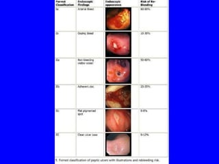 - Initial management of UGIB includes IV fluids, blood transfusions if needed, and upper endoscopy within 24 hours to identify the source of bleeding and guide treatment. Management depends on the cause and risk of rebleeding.