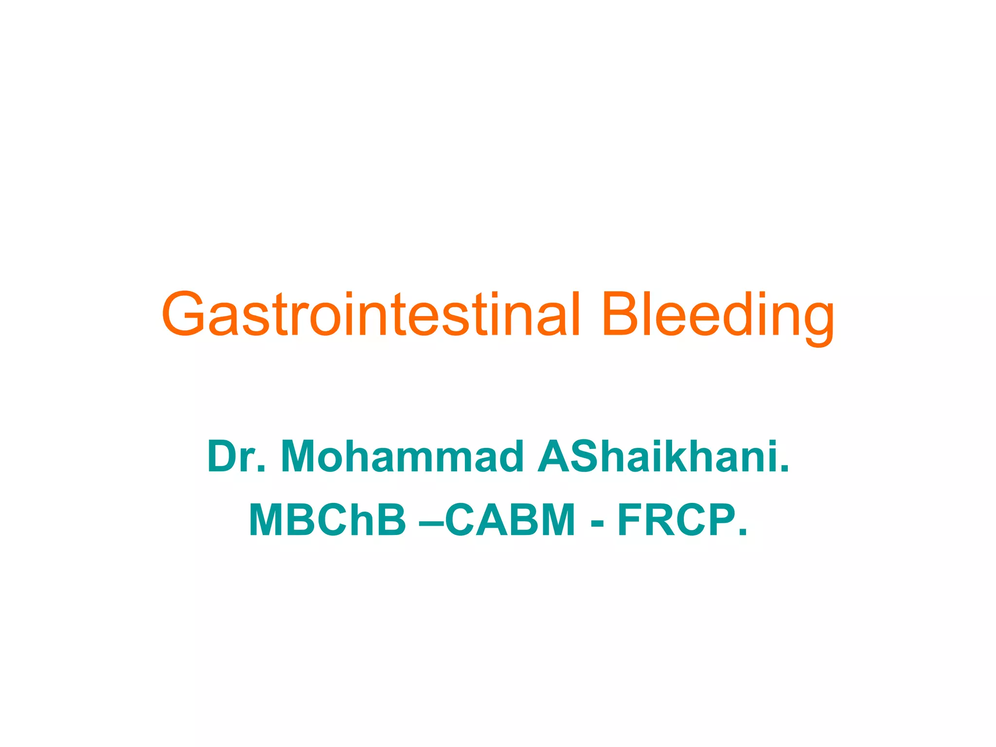 This document discusses gastrointestinal bleeding, focusing on upper GI bleeding (UGIB) and lower GI bleeding (LGIB). It covers the typical presentation, evaluation, and management of acute UGIB and LGIB. For UGIB, initial management involves hemodynamic stabilization, upper endoscopy to identify the source within 12 hours, and endoscopic therapy if possible. For high risk lesions, angiography or surgery may be needed. For LGIB, initial steps are the same while colonoscopy is preferred for evaluation once stable, though angiography can be used if bleeding is ongoing. Most episodes of UGIB and LGIB stop spontaneously without intervention.