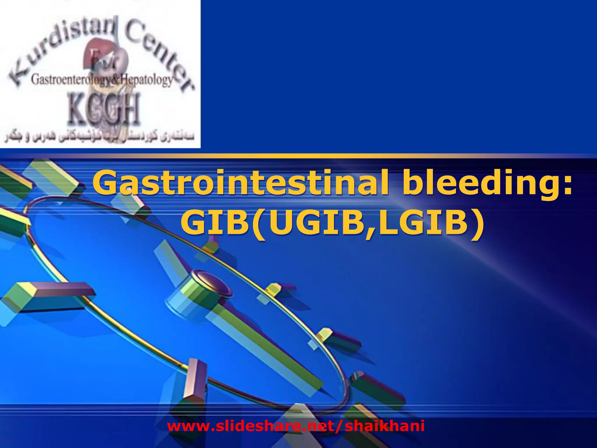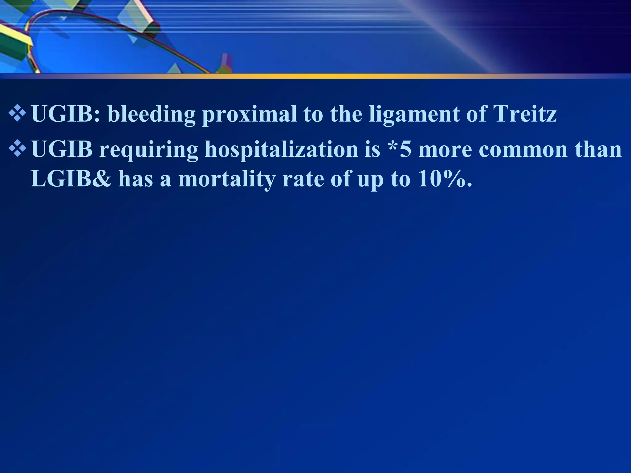 1) Gastrointestinal bleeding can occur in the upper or lower GI tract. UGIB is more common and has a higher mortality rate than LGIB.