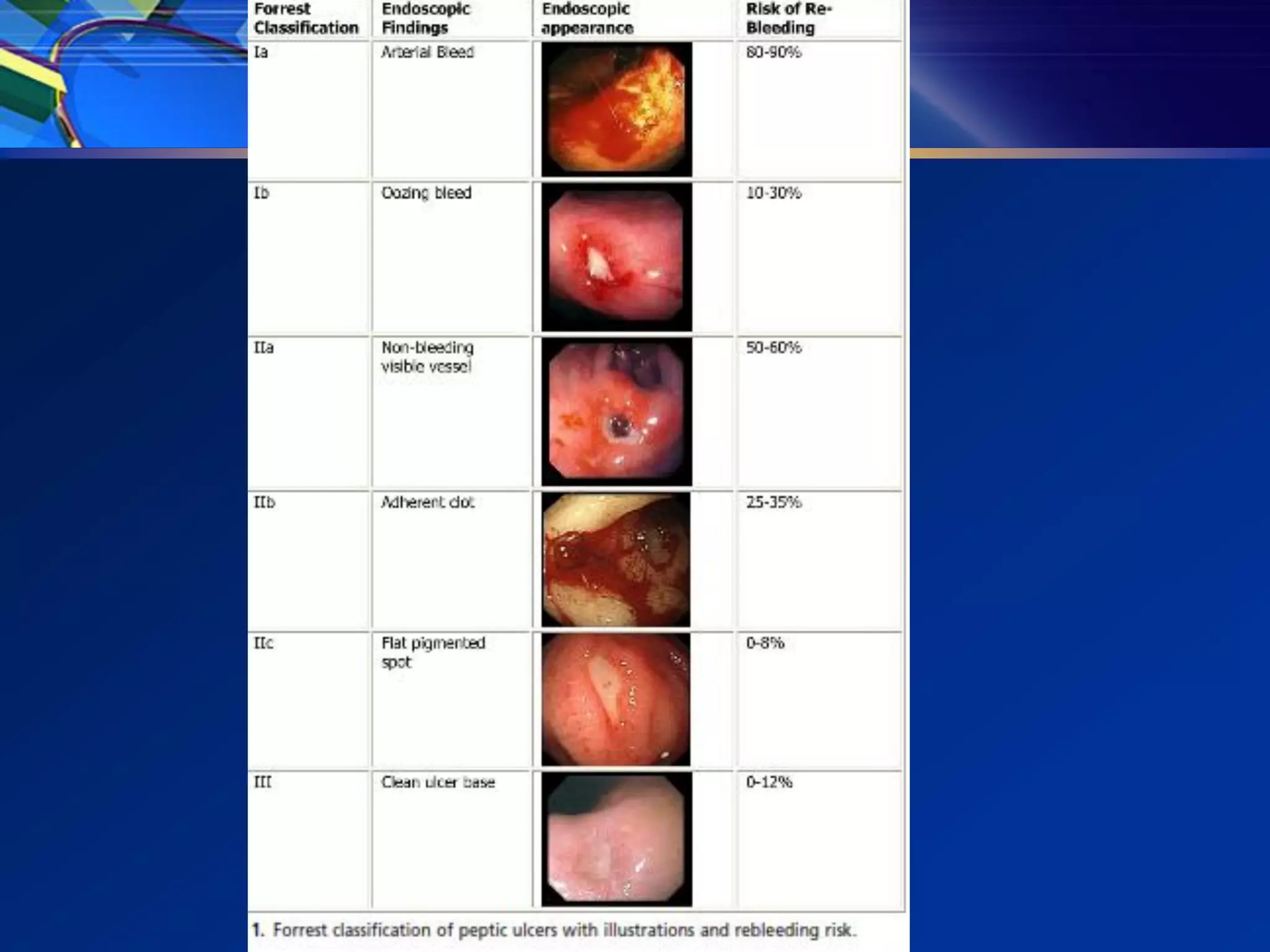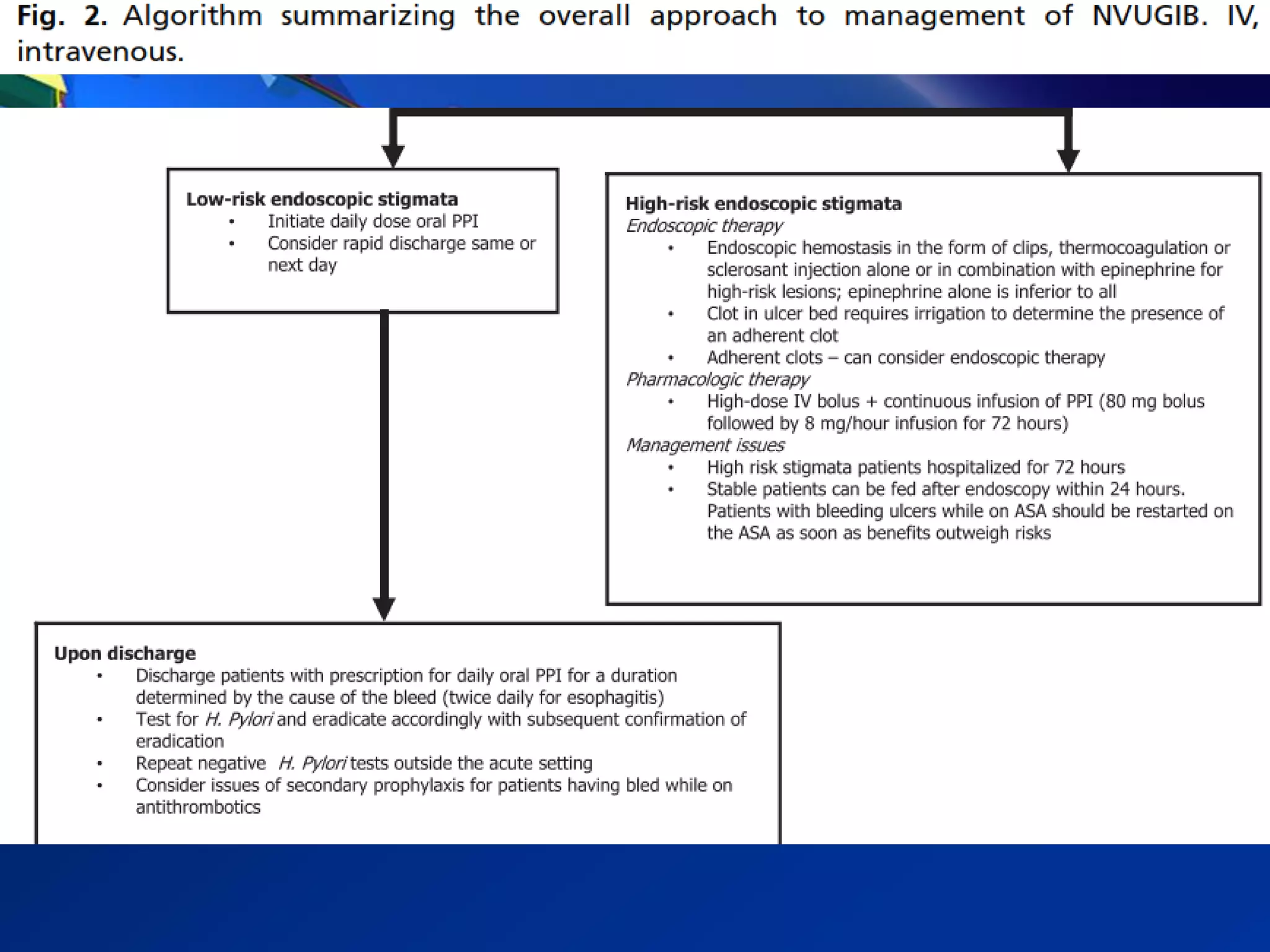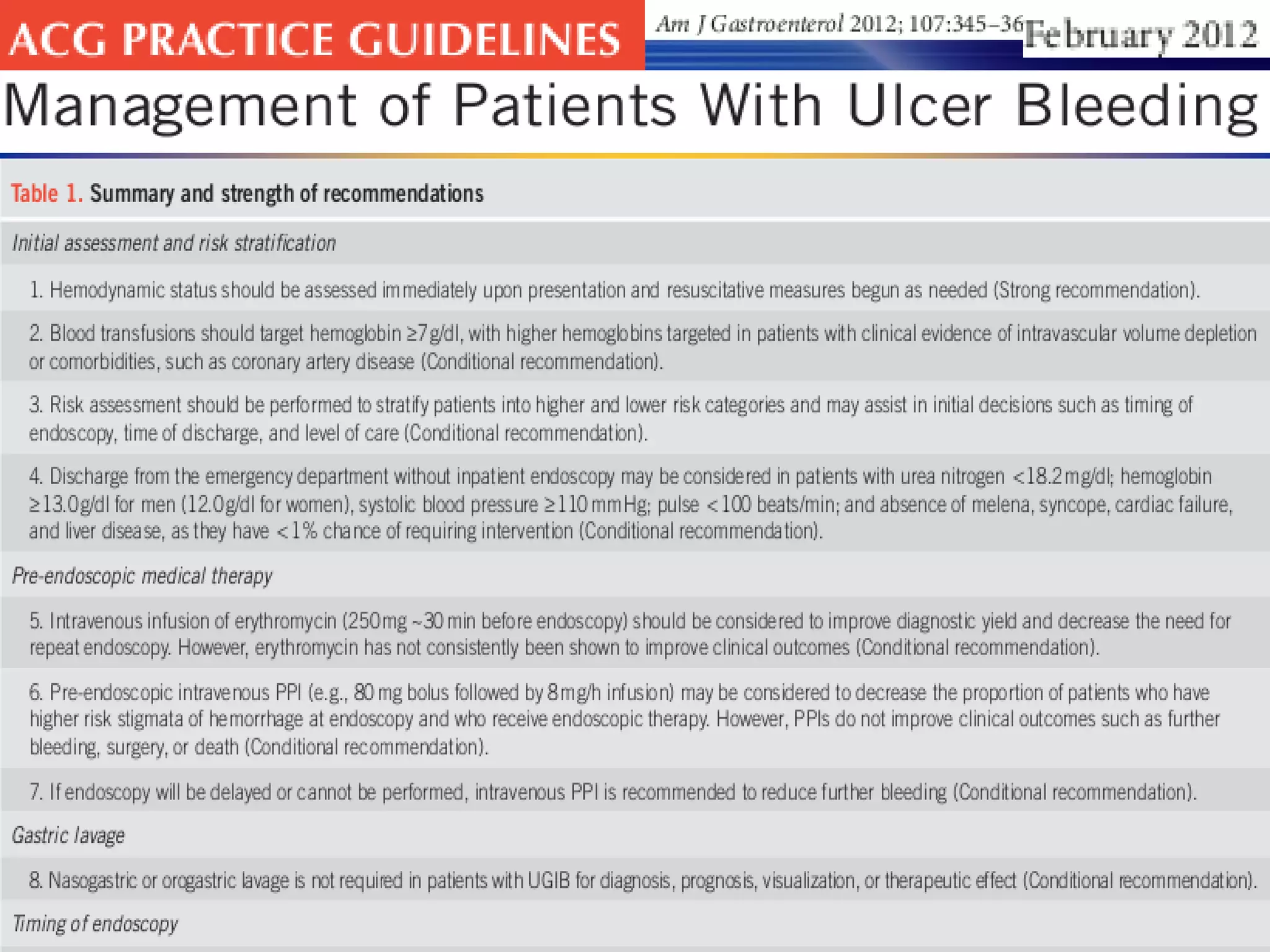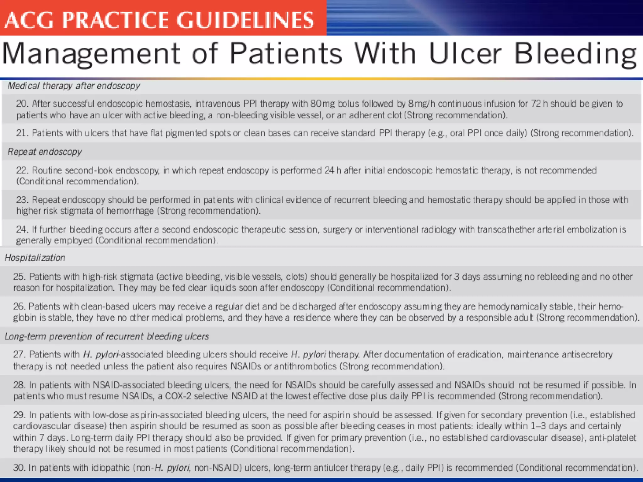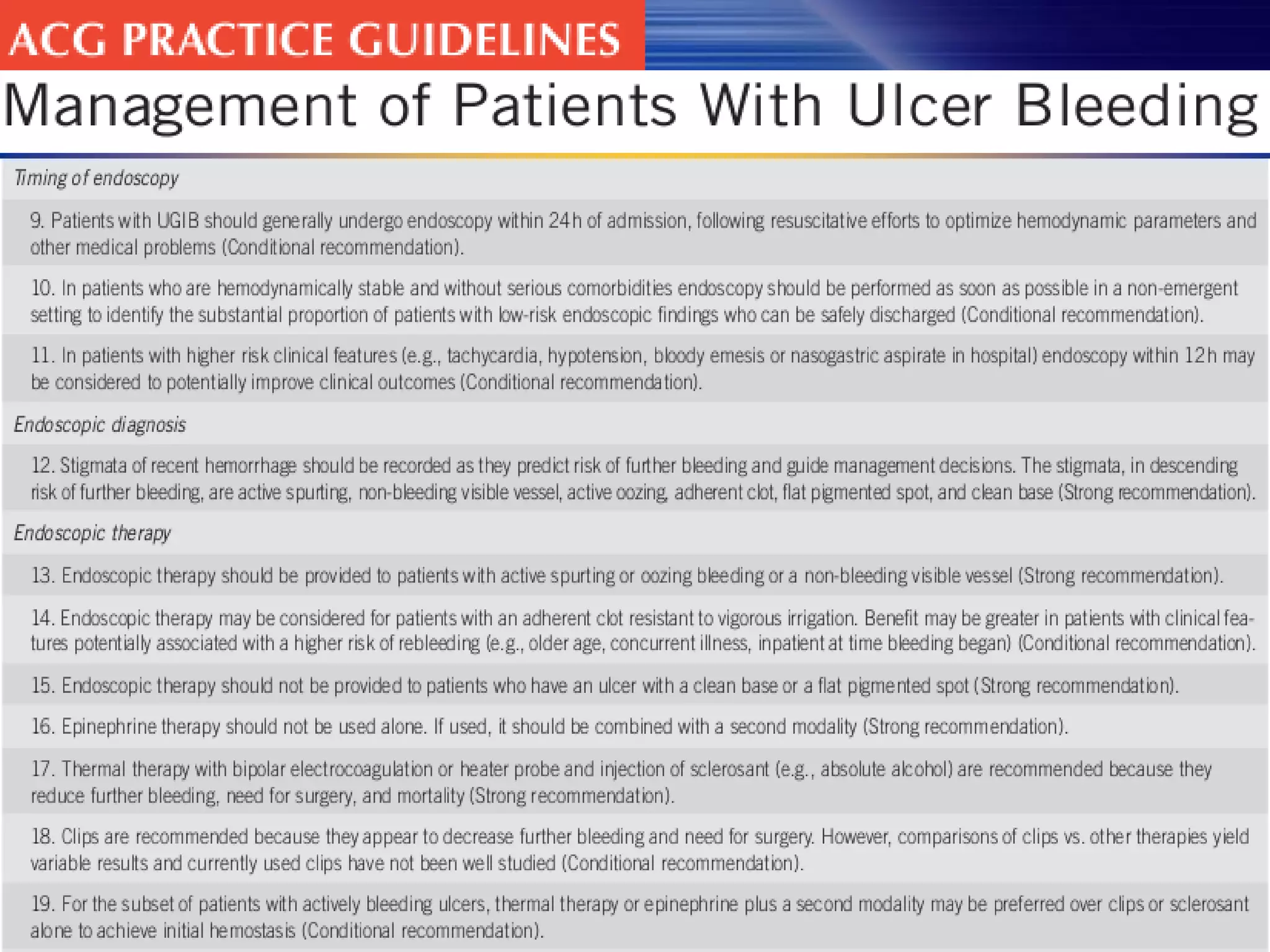 3) Guidelines recommend adequate resuscitation, antisecretory therapy for suspected peptic ulcer bleeding, and endoscopic treatment combining epinephrine injection with a second modality for high-risk ulcers to achieve hemostasis.