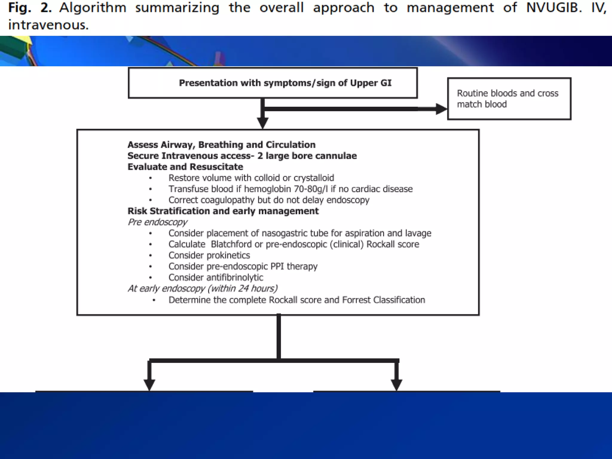 2) Common causes of UGIB include peptic ulcer disease, erosive gastritis, and esophageal tears. Management involves resuscitation, risk stratification, early endoscopy within 24 hours, and endoscopic therapy for high-risk lesions.