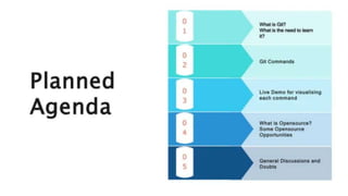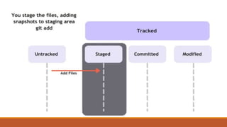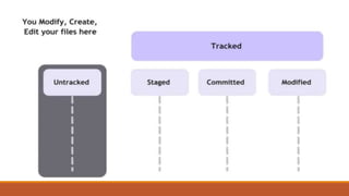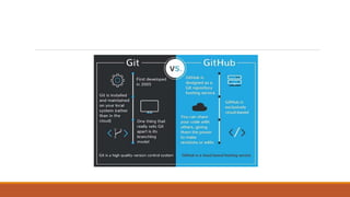 Git is a distributed version control system that allows for both local and remote collaboration on code. It provides advantages like speed, simplicity, integrity, and support for parallel development through features like branching. Common Git commands include git init to start a new repository, git add to stage files, git commit to save changes, git push to upload local work to a remote repository, and git pull to download remote changes. GitHub is a popular hosting service for Git repositories that provides a graphical interface and social features.