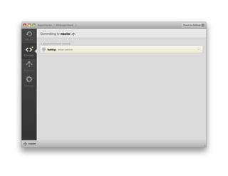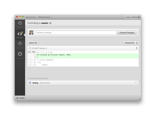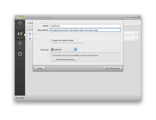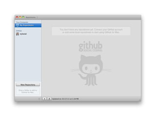 This document provides an overview of Git and GitHub for code versioning and sharing. It discusses key Git concepts like branches, commits, and merges. It also demonstrates how to perform basic Git commands from the command line interface. GitHub is presented as a tool for easy collaboration on Git projects through features like forking and pull requests. Overall the document serves as an introduction to using Git and GitHub for researchers and code sharing.
