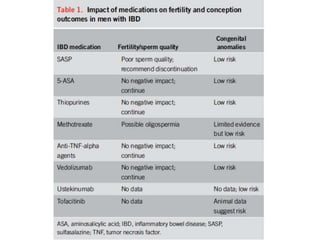 - Sulfasalazine can reversibly reduce male fertility, so it is recommended to discontinue 3-4 months prior to conception. Most other IBD medications do not significantly impact fertility.