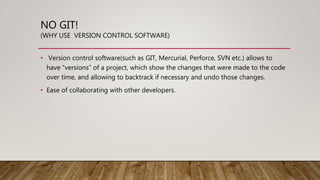 Git is version control software that allows tracking changes to code over time. It allows easy collaboration and offline work. Git works with entire code repositories rather than individual files, offering better performance than other version control systems. The basic Git workflow involves adding files, committing changes to a local repository, and pushing commits to a remote server repository. Branches allow isolated development and merging of features.