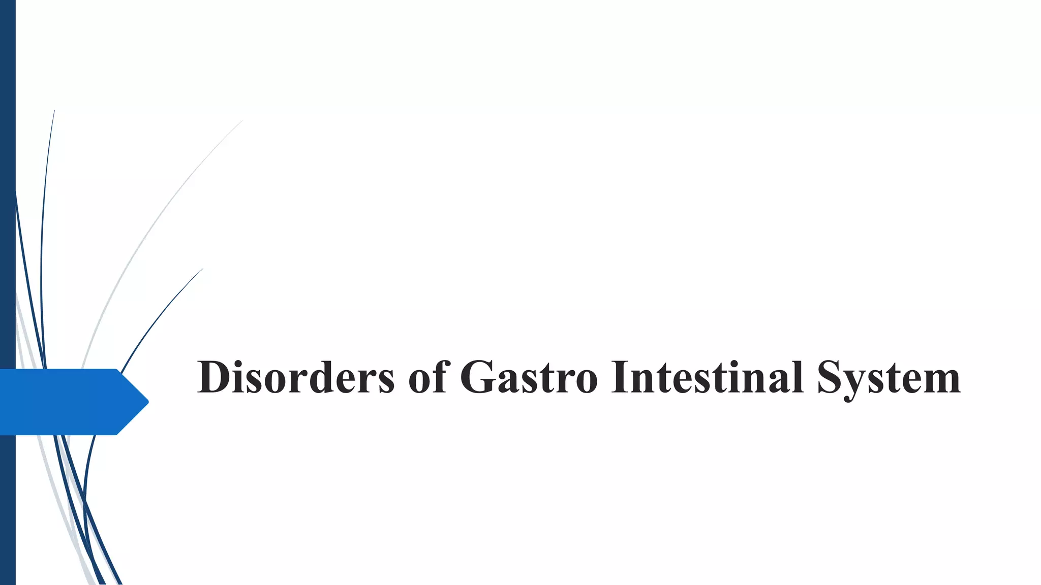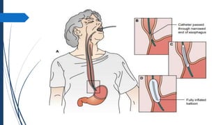 The document discusses disorders of the gastrointestinal system, beginning with a review of the anatomy and physiology of the GI tract. It describes the components and functions of the upper and lower GI tract. Key diagnostic tests are outlined including barium swallow, upper endoscopy, and colonoscopy. The disorder Achalasia is summarized, noting its causes, symptoms of dysphagia and chest pain, and treatments including medications to decrease LES pressure and forceful dilation.