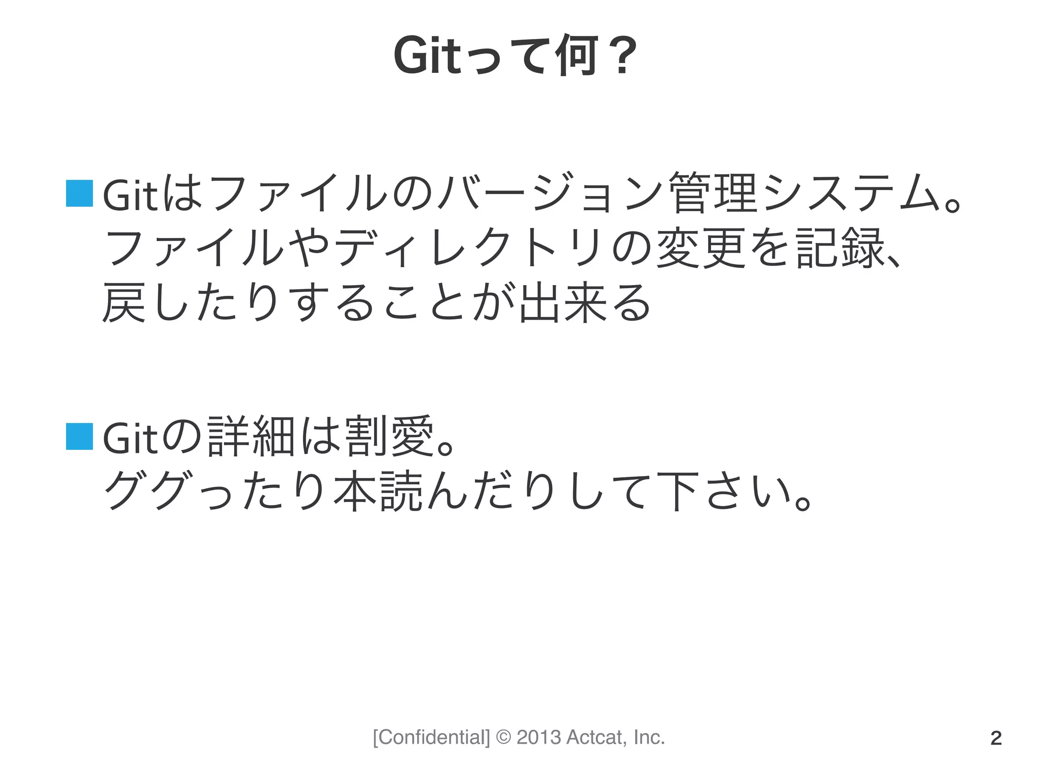 Actcat, Inc. Gitって何? n Gitはファイルのバージョン管理システム。 ファイルやディレクトリの変更を記録、 戻したりすることが出来る n Gitの詳細は割愛。 ググったり本読んだりして下さい。 2