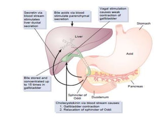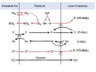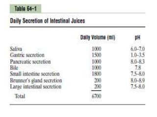 This document summarizes the secretions of the gastrointestinal tract. It describes the salivary glands and their secretions including serous and mucus types. It then discusses the stomach secretions including hydrochloric acid from parietal cells and pepsinogen from chief cells. The pancreas secretes bicarbonate and digestive enzymes including trypsinogen and chymotrypsinogen to digest proteins, carbohydrates, and fats in the small intestine. Regulation and functions of these secretions are also covered.