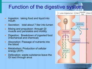 The digestive system breaks down ingested food into smaller molecules that can be absorbed and used by the body. It includes the alimentary canal and accessory organs. In the alimentary canal, food is ingested, digested, and absorbed. Accessory organs like the liver, pancreas and gallbladder secrete enzymes and bile to aid in digestion. Nutrients are then absorbed and circulated while waste is eliminated, completing the digestive process.