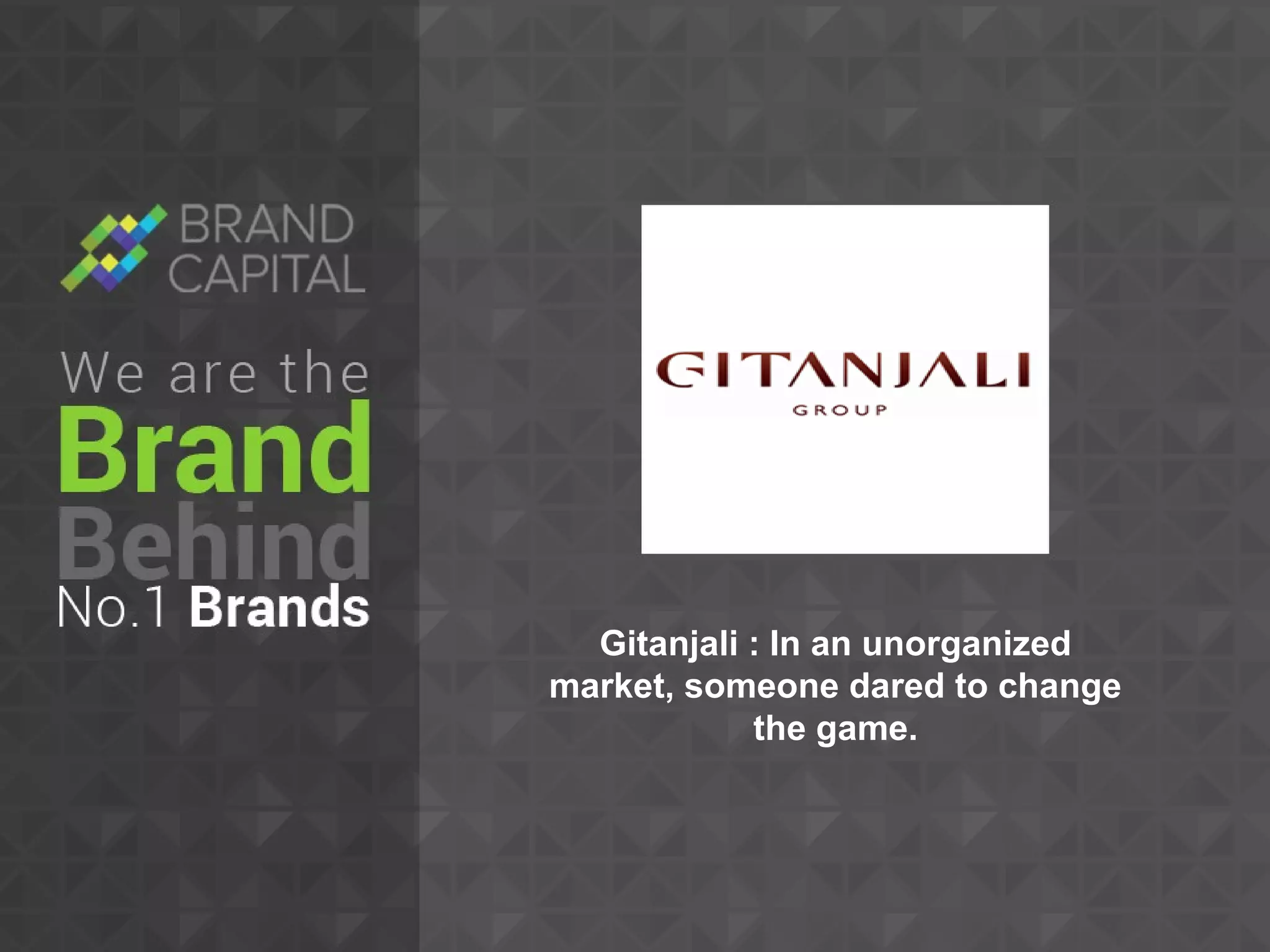 Gitanjali operated in an unorganized jewelry market but dared to create a brand, partnering with Brand Capital to strengthen its brands. This helped Gitanjali grow its revenues 45% year-over-year to INR 9456 Cr, with 4 of the top 5 jewelry brands under the Gitanjali group. Through branding, Gitanjali established strong market positions and eliminated unorganized competitors.