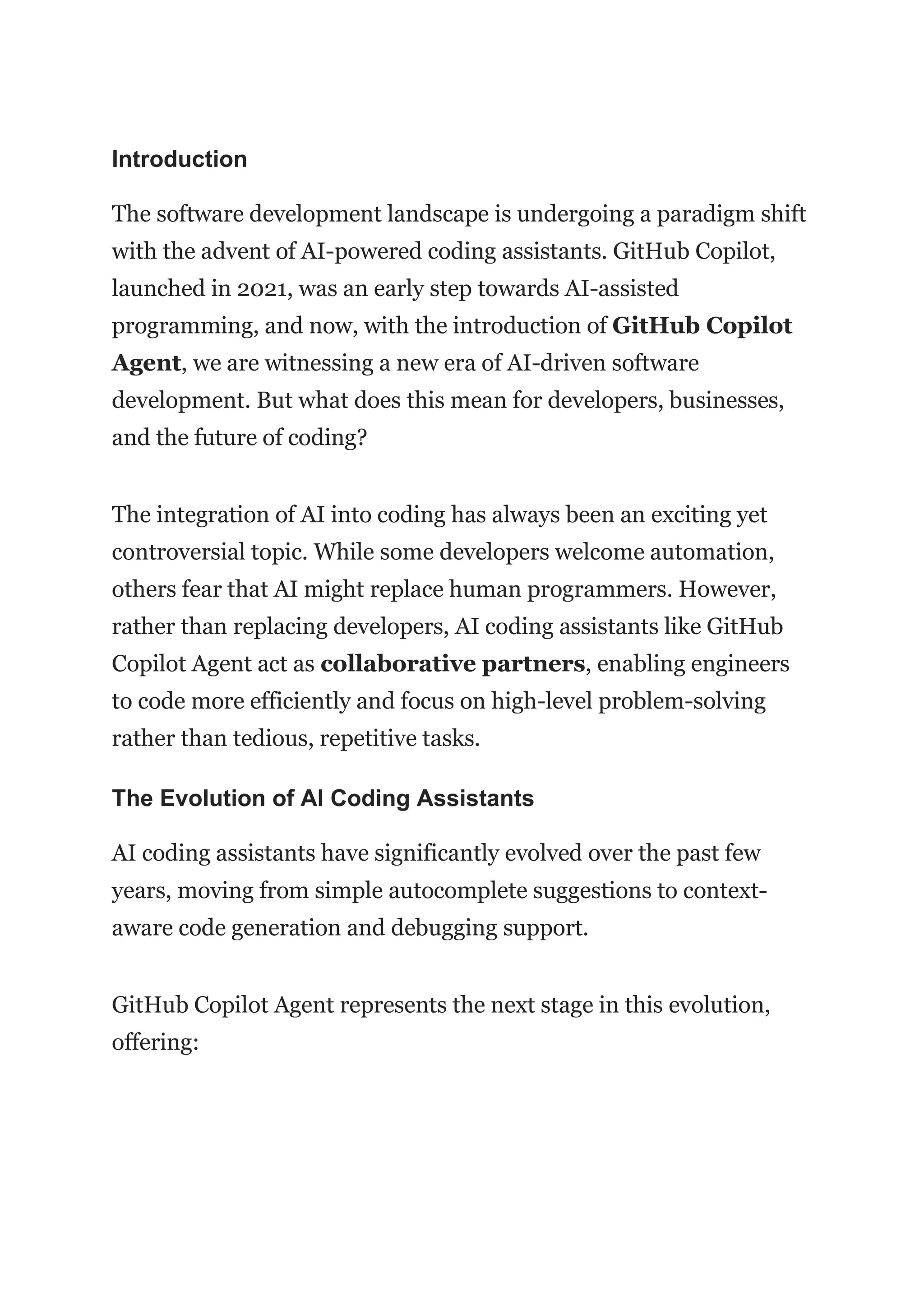 The document discusses the transformative impact of AI-powered coding assistants, particularly GitHub Copilot Agent, on software development, emphasizing their role as collaborative partners rather than replacements for human developers. Key advancements include deeper codebase understanding, end-to-end assistance, and enhanced code quality through AI-driven suggestions. While the integration of such tools presents challenges regarding reliability, ethics, and human oversight, it ultimately reshapes development practices and allows for greater innovation and productivity.